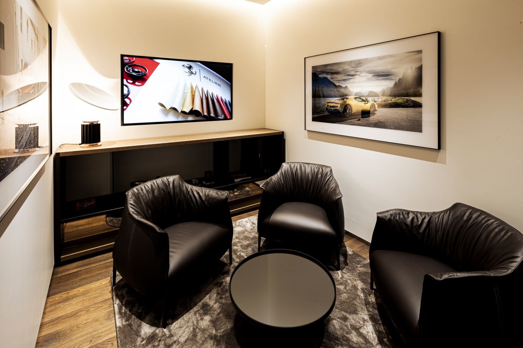 ー仕上げのソファーや、フェラーリの歴史を綴った書籍が置かれています。