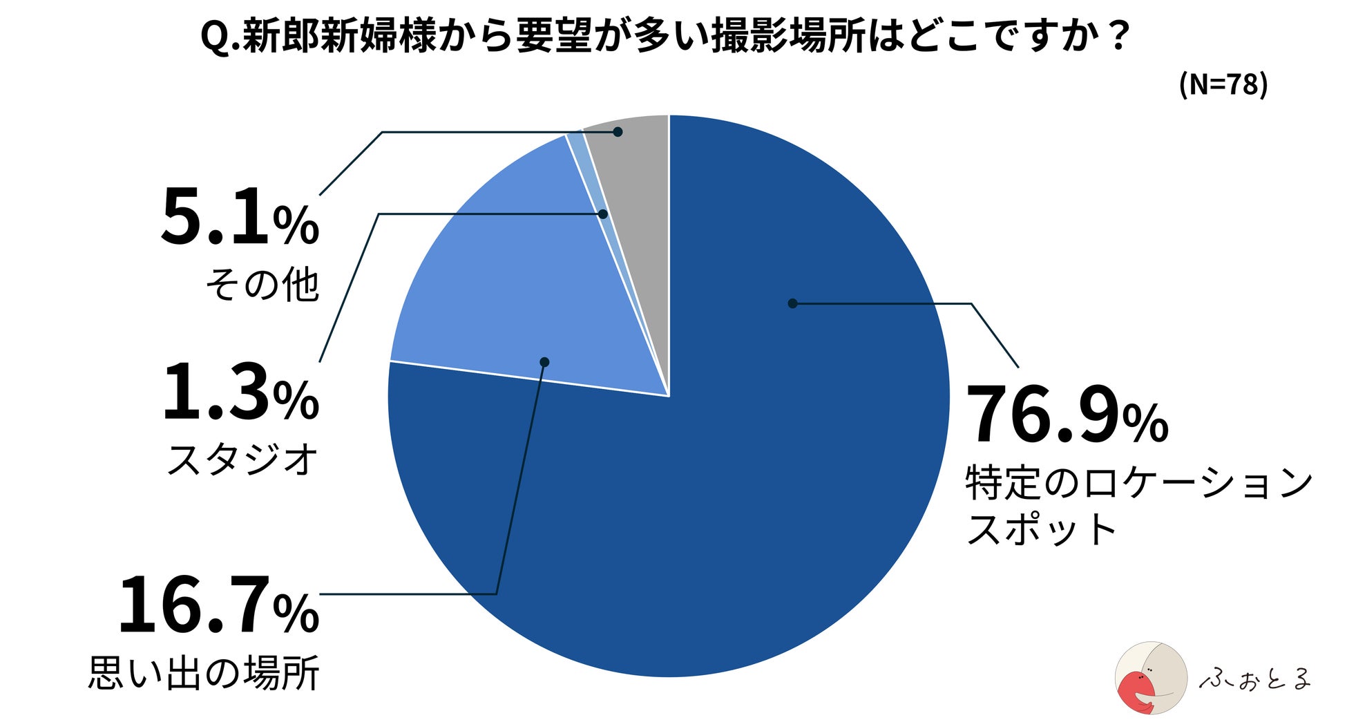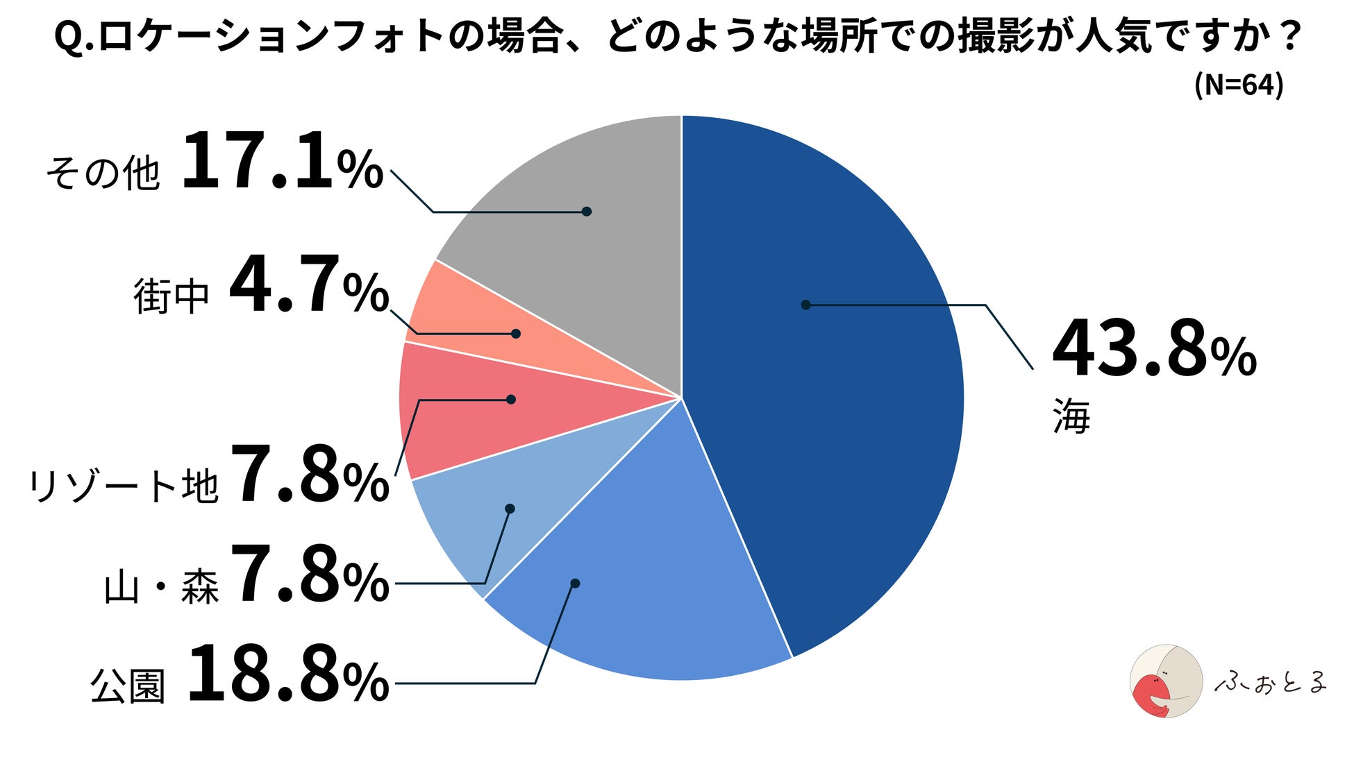 ロケーションフォトの撮影場所は、「海」が圧倒的な人気を誇り全体の44%を占める。公園19%、山・森は8%。