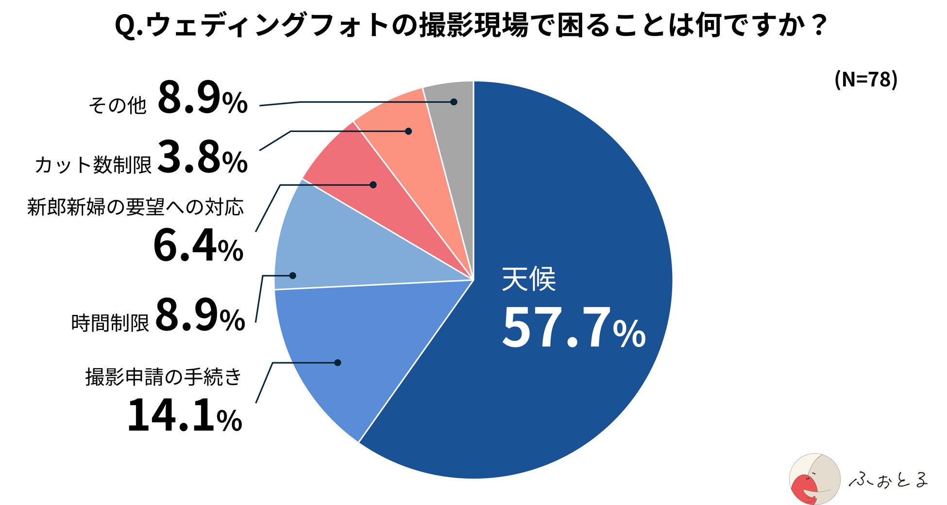 ウェディングフォトの課題は「天候」が群を抜いて多く58%、次に「撮影申請などの手続き」が14%。