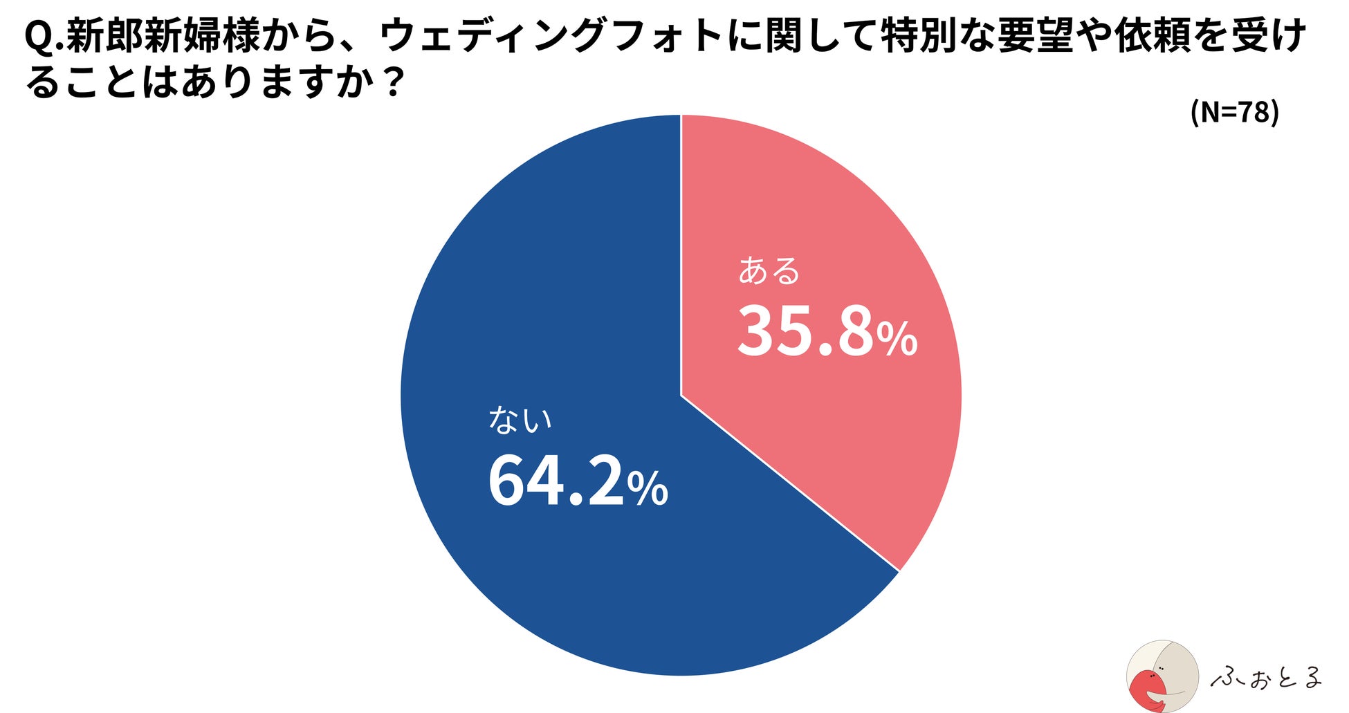 「ある」の回答には、「新郎と新婦のモチベーション格差」「口数が少ない方の希望のくみ取り」「インバウンドが多いので言葉の問題と価値観の違いがある」などがあった。また、「お客様に撮影イメージがない。なんかいい写真」といった、漠然とした要望への対応に難しさを感じているフォトグラファーもいた。