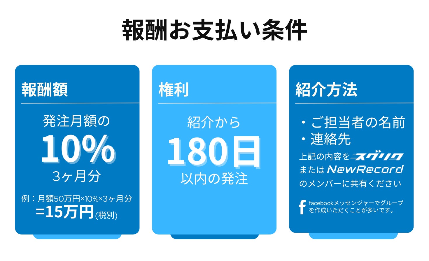 中途採用に困っている企業の経営者・人事をご紹介いただき、その企業がスグリクに発注いただいたら一定の報酬をご紹介者にお渡しするプログラムです。