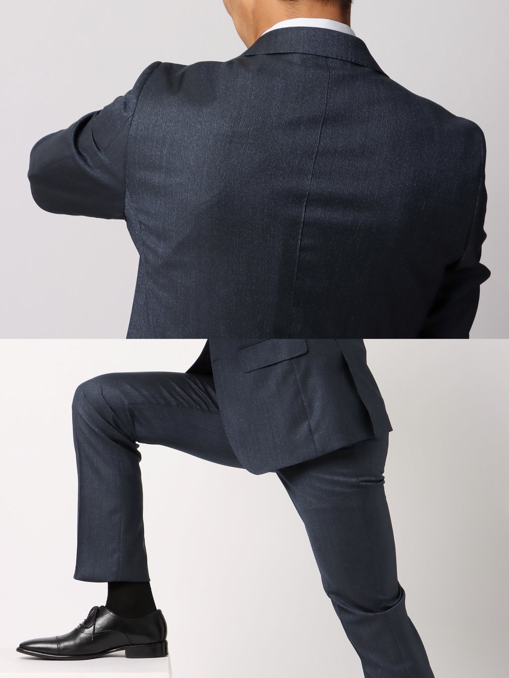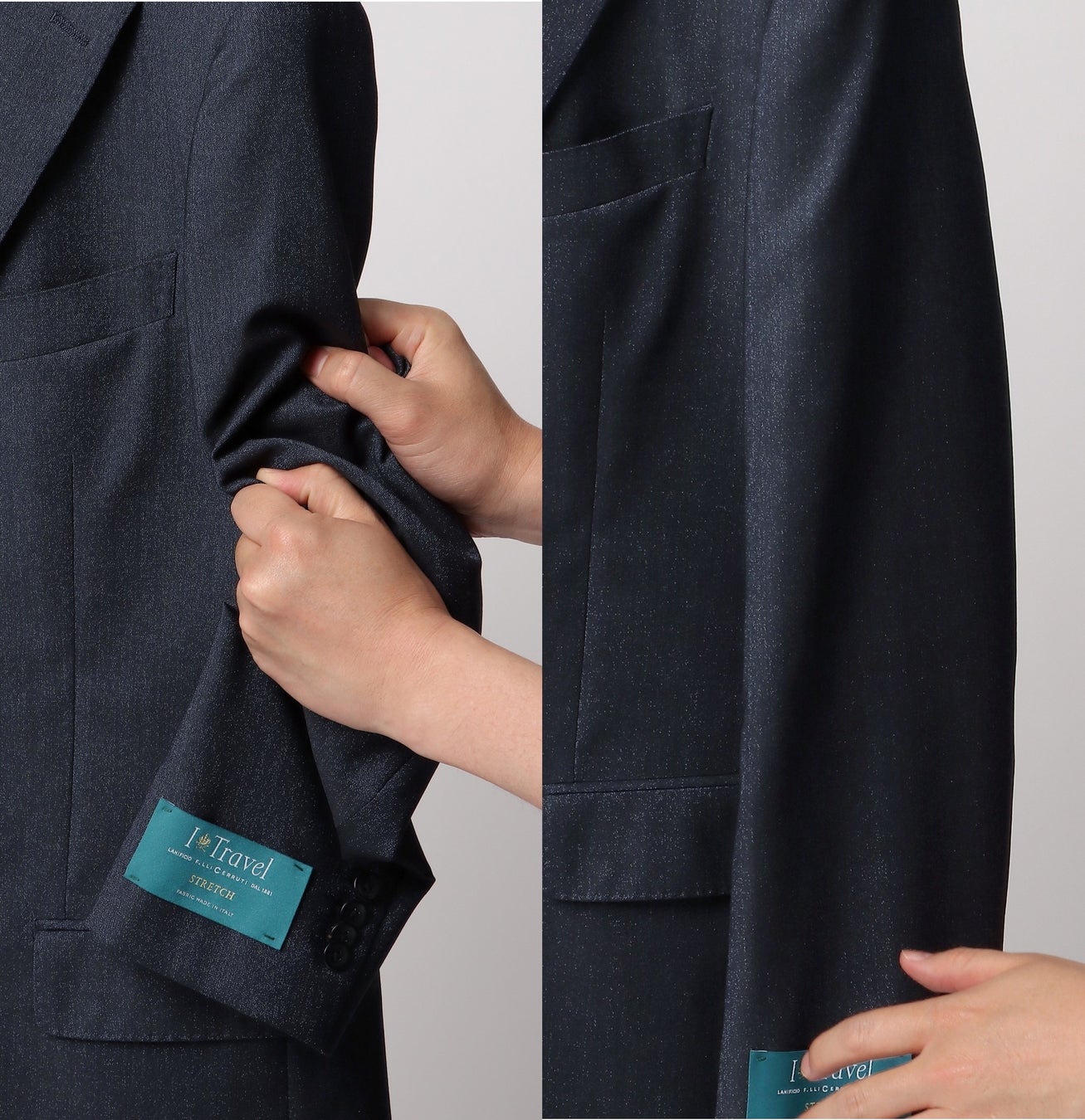 昨今のオフィスウェアの多様化により、市場では機能的なスーツが求められる傾向にあります。今回採用したチェルッティのアイトラベルは、ストレッチ性、防シワ性が高く、出張の多いビジネスパーソンにおすすめです。また、今回選定した生地はややデニムライクな見え方なので、通常の無地スーツとは一味違う雰囲気をお楽しみいただけます。