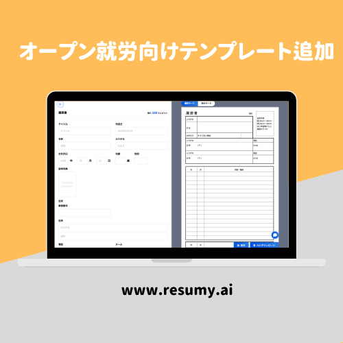 2023年4月25日、履歴書・職務経歴書作成サービスRESUMY.ai(レジュミーAI)は、オープン就労向けのテンプレートを追加することを予定しております。これにより、オープン就労を希望する求職者が、キーワードや短文を入力するだけで数分でテンプレートに沿った経歴書を作成することができます。