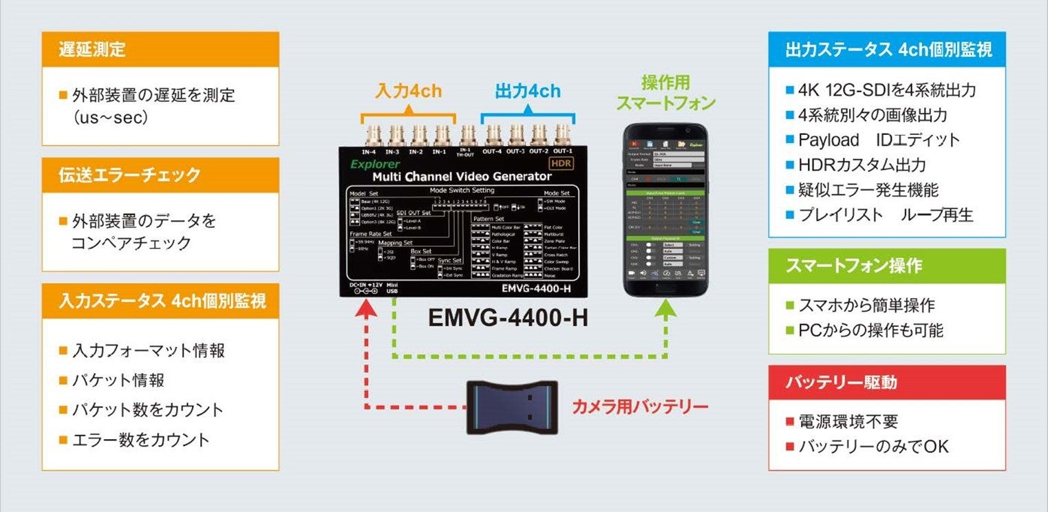 高精細映像のテスト信号を出力できる小型信号発生器は、屋外での映像機器の動作確認や実験室での研究開発等に使用されています。今回展示する「EMVG-4400-H/H8」は、高精細映像のテスト信号を出力できるだけでなく、SDI*²信号の各種測定機能も有していることから、簡易な測定装置としても様々な分野で利用することができます。当日はSDIのテストパターン送出機能や入力ビデオのステータス検出機能について紹介するデモ展示を行います。