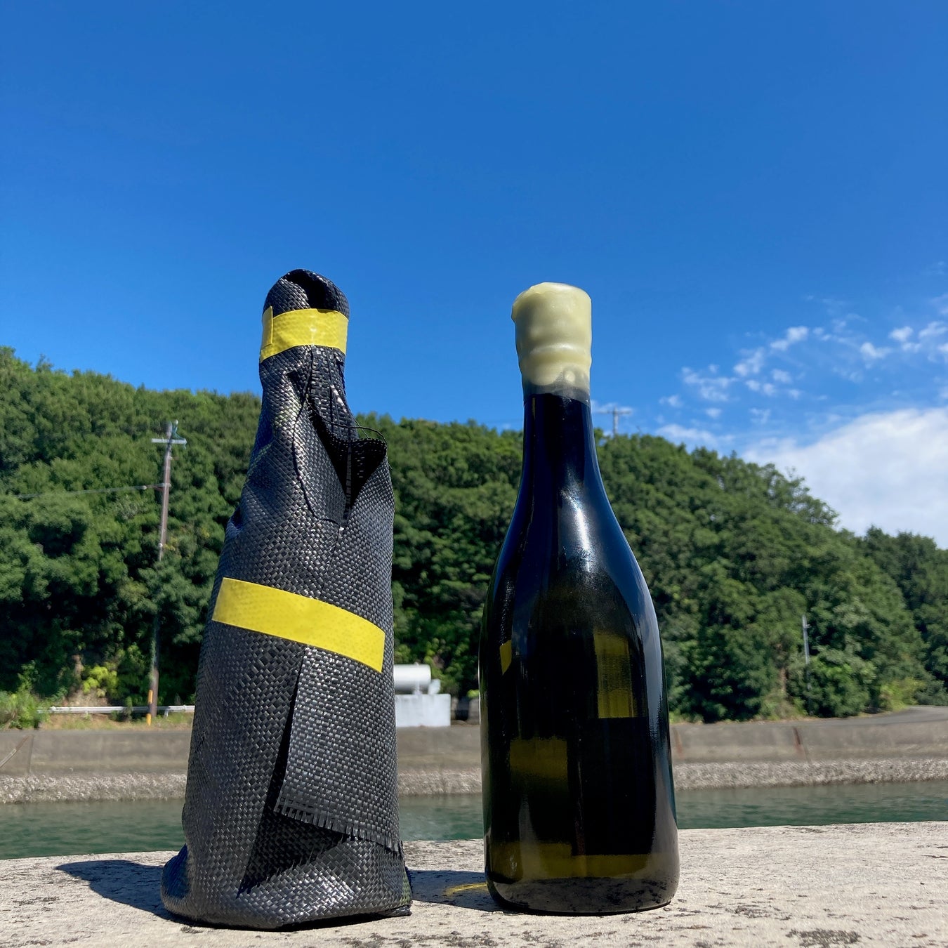 海底熟成酒用に、通常より厚めの水圧に耐えられる瓶を使用しております。金属の栓は海水で錆びてしまう事から、プラスチックのものを使用しさらに蝋で密封、また紫外線による風味劣化防止と生物の付着を避ける為一本一本カバーを巻いております。