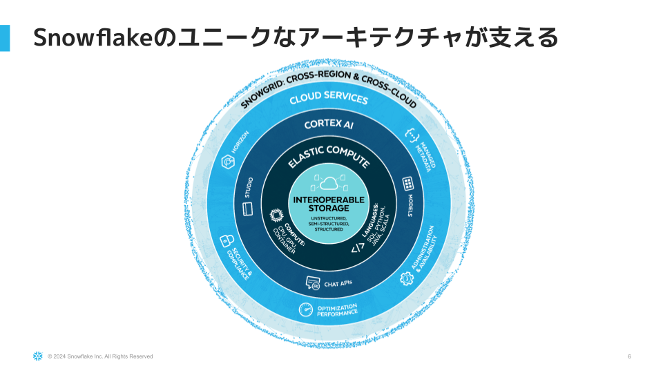 井口は冒頭、製品のブランド名が「Snowflake データクラウド」から「Snowflake AIデータクラウド」となった理由について、「エンタープライズAIを進めるにあたって、企業でAIをより加速していくためには統合されたデータ基盤が必要であり、また、データをより活用していくためにはAIの活用は必須。シンプルで統合されたセキュアなクラウドデータ基盤とAIが融合することによって、よりお客様のデータ活用が進んでいく」と強調。相互運用可能なストレージと伸縮性に優れたマルチクラスターコンピュートレイヤー、強力なグローバルクラウドサービスレイヤーに、AIのエッセンスが加わることでデータ活用を加速していくという現在のSnowflakeのアーキテクチャを紹介しました。