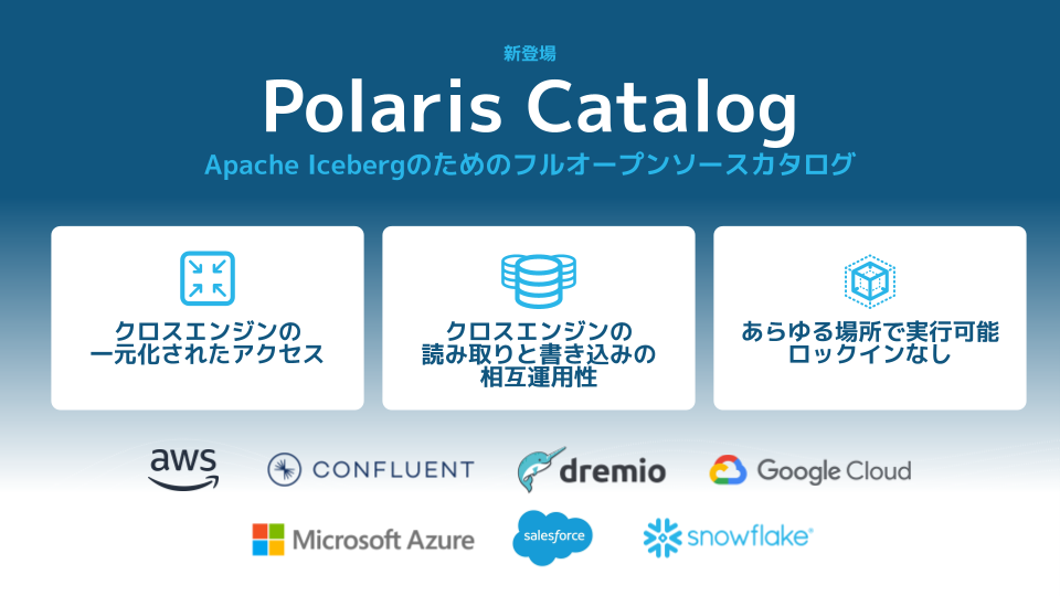 ■Snowflake「Polaris Catalog」を発表 AWS、Google Cloud、Microsoft Azure、Salesforceなど相互運用性へのコミットメントを強化(https://www.snowflake.com/news/snowflake-unveils-polaris-catalog-and-emphasizes-commitment-to-interoperability-with-aws-google-cloud-microsoft-azure-salesforce-and-more/?lang=ja):データレイクハウス、データレイク、その他の最新アーキテクチャの実装に選択されるオープンスタンダードであるApache Iceberg向けの、ベンダーニュートラルでオープンなカタログ実装であるPolaris Catalog (ポラリス カタログ) を発表しました。Polaris Catalogは、今後90日以内にオープンソース化され、企業やIcebergコミュニティ全体に、Amazon Web Services(AWS)、Confluent、Dremio、Google Cloud、Microsoft Azure、Salesforceなどとの完全なエンタープライズ・セキュリティとApache Icebergの相互運用性を備えた、新たなレベルの選択肢、柔軟性、データ制御を提供する予定です。