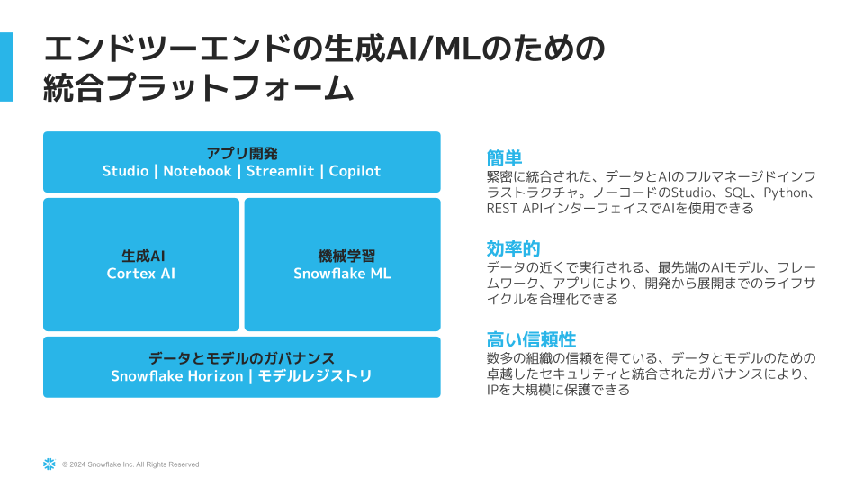 「エンタープライズAIの加速」については、データとモデルのガバナンス「Snowflake Horizon」を基盤に、生成AIの「Cortex AI」、機械学習の「Snowflake ML」があり、その上にアプリ開発のAIがあるというエンドツーエンドの生成AI/MLのための統合プラットフォームの構造を解説。SnowflakeのLLMモデル「Snowflake Arctic」の特徴については、エンタープライズインテリジェンス、より安価でパフォーマンスの高い効率性、Polaris Catalogと同様にフルオープンであるといった点を紐解きました。