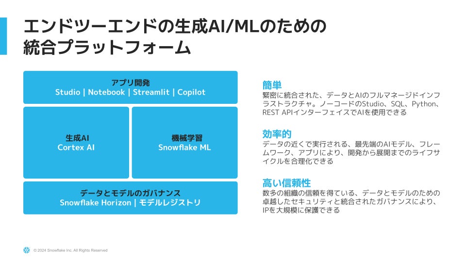 ■Snowflake Cortex AIとSnowflake MLを新たに進化 業界をリードするエンタープライズAIをより多くのユーザーに提供(https://www.snowflake.com/news/snowflake-brings-industry-leading-enterprise-ai-to-even-more-users-with-new-advancements-to-snowflake-cortex-ai-and-snowflake-ml/?lang=ja):AIを活用したアプリケーションを簡単で効率的に、かつ信頼性の高い方法で作成し、お客様のエンタープライズAIの推進するSnowflake Cortex AIの新たなイノベーションと機能強化を発表しました。これには、新たなチャットエクスペリエンスも含まれ、数分でチャットボットを開発できるようになり、組織のデータと直接会話して必要な回答を迅速に得ることができます。また、Snowflake MLを通じて、機械学習(ML)の統合されたエクスペリエンスを提供することで、モデルの運用化を加速し、開発者がMLのライフサイクル全体にわたってモデルと機能を構築、発見、管理できるようにします。