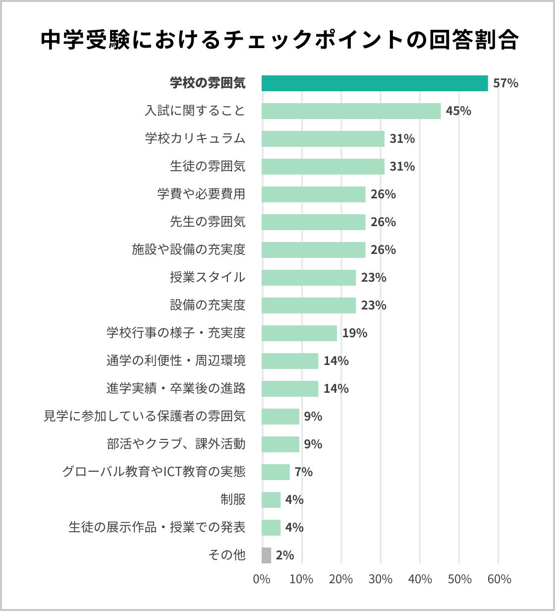 中学受験時の見学では、「学校の雰囲気」が57%、「入試に関すること」が45%、「生徒の雰囲気」が31%、「学校カリキュラム」が31%と特に重視されていました。中学校の段階では、入試に関する情報が重視されることが特徴的です。また、生徒の様子や学校全体の雰囲気を確認することも重要視されています。