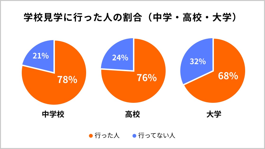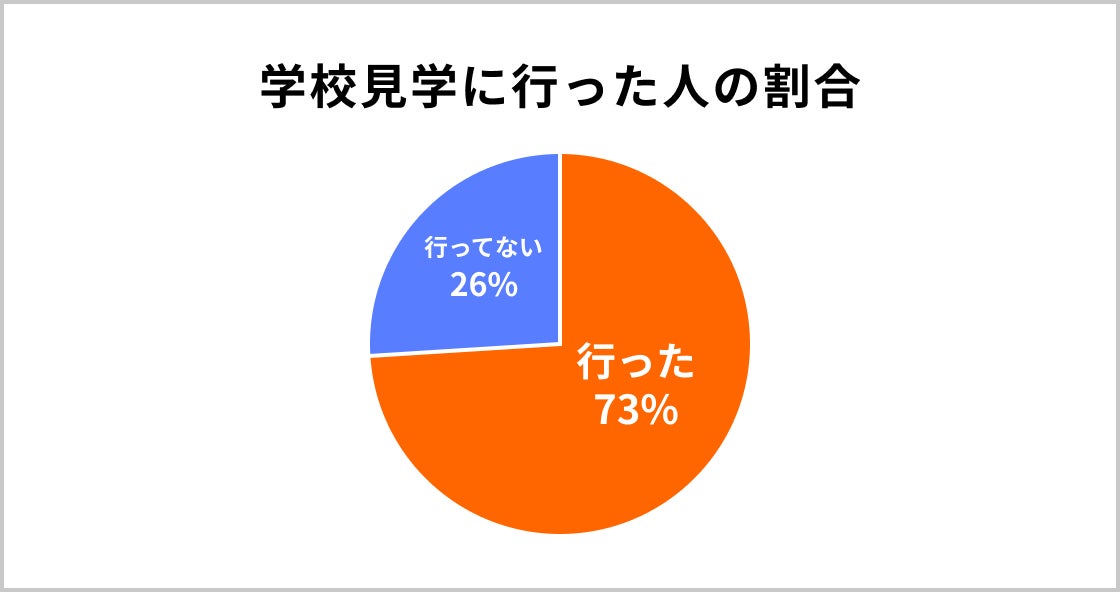 志望校を選ぶ際、校内の雰囲気や在校生の様子など生の情報に触れることができる学校見学はとても貴重な機会です。アンケートによると、中学校受験、高校受験、大学受験を経験した人の約74%が「学校見学に行った」と回答。半数以上の保護者や生徒が学校見学に参加しているという結果からも、学校見学の重要性が分かります。
