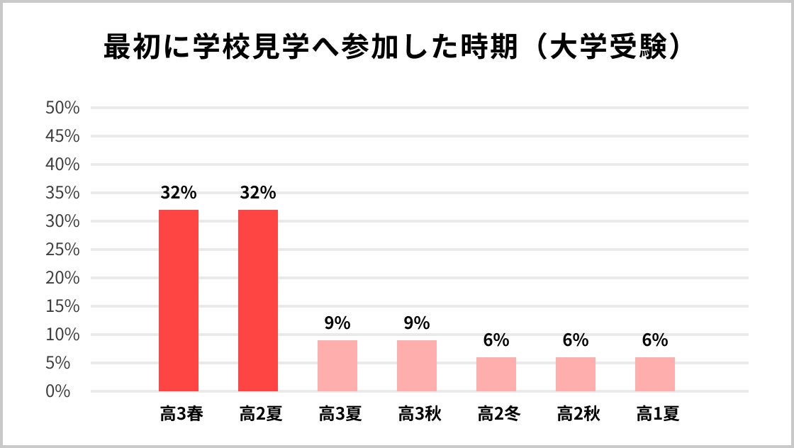 受験準備や進路決定のための情報収集、模試、オープンキャンパスなどは「春」「夏」の時期に行われるため学校見学に参加する人が多くなります。学年によっては受験生になる前段階から学校見学を始めている人も一定数いるようです。