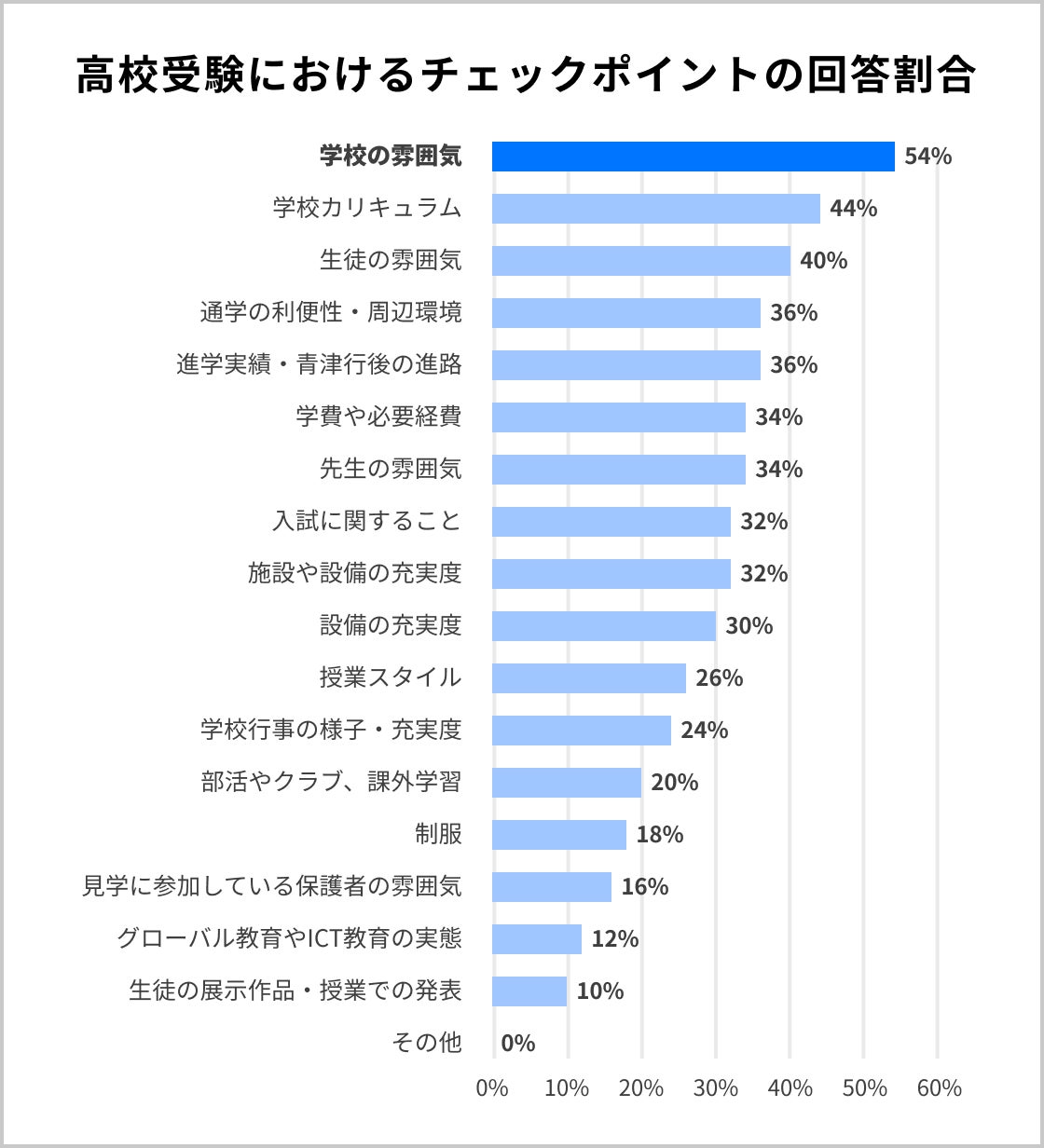高校受験時の見学では、「学校の雰囲気」が54%、「学校カリキュラム」が44%、「生徒の雰囲気」が40%と高い回答数を占めており、高校生活ではカリキュラムの内容や生徒の様子が特に重要視されていることがわかります。また、「制服」が18%、「部活やクラブ、課外活動」が20%も比較的高い関心を集めていることから、課外活動や制服のデザインも学校選びにおいて重要な要素となっていることが予想できます。