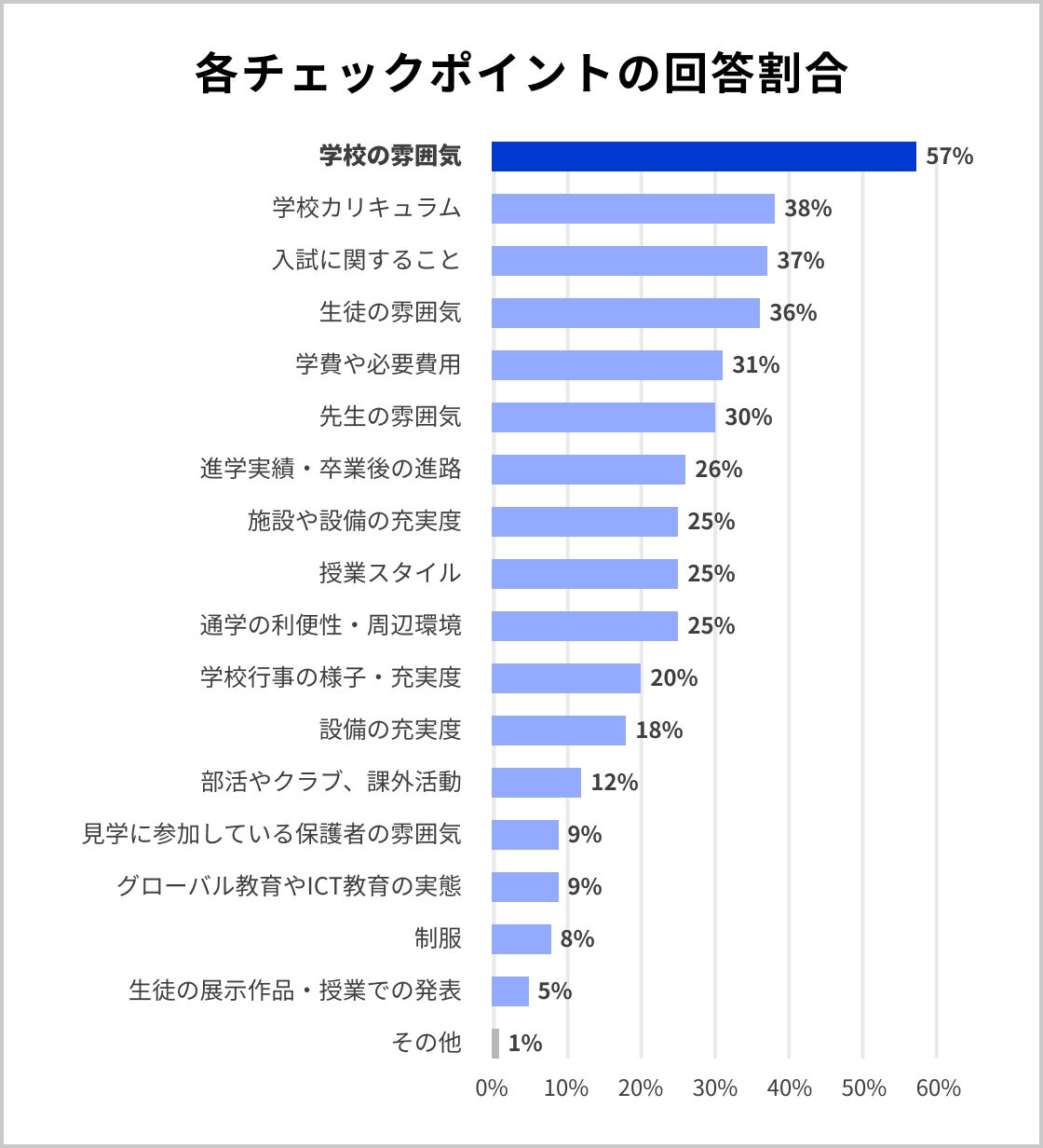 学校見学の重要性を実感いただけたと思いますが、では学校見学にいったときはどのようなポイントを重視して見るべきか悩まれる方もいると思います。学校のウェブサイトやパンフレットでは得られない現地の雰囲気や、実際にそこで学ぶ生徒の様子などを直接確認できる学校見学は貴重な機会です。今回のアンケートでは実際に学校見学を経験した保護者を対象に、どのようなポイントを重視してチェックしたかについて調査しました。