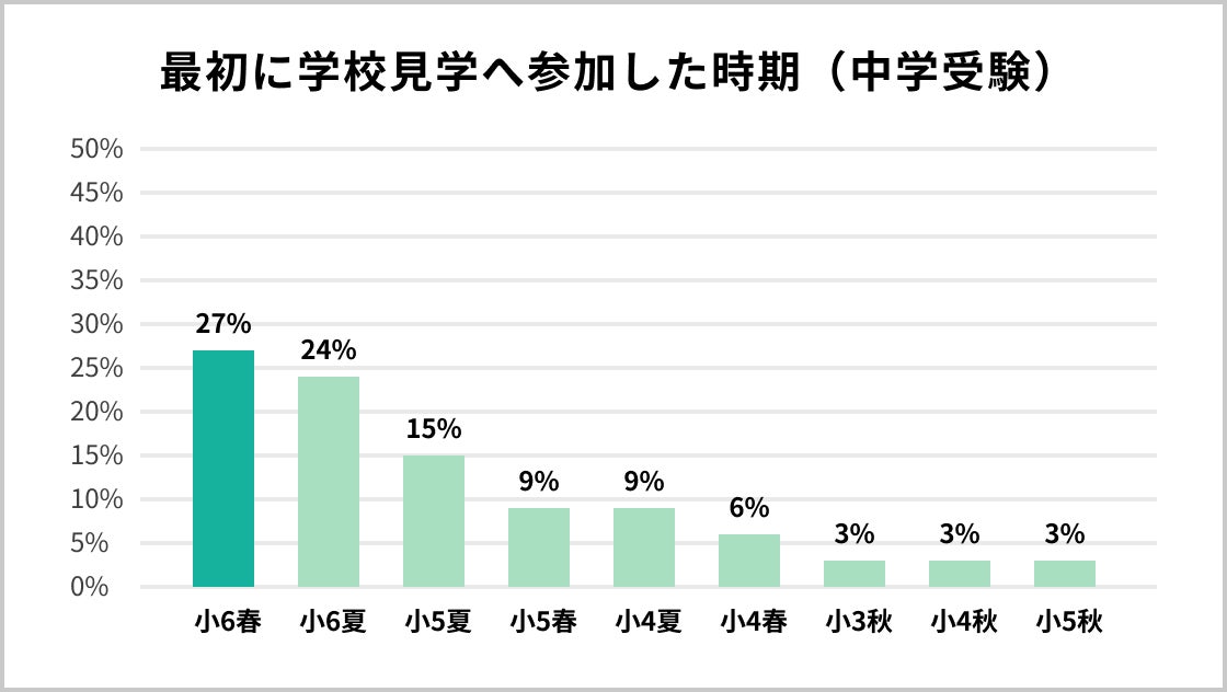 学校見学に参加したタイミングですが、中学校受験では「小6 春」(27%)と「小6 夏」(24%)に活動が集中しており、これは小学校6年生の終わりと夏休み期間に学校見学や受験準備がピークを迎えることを示しています。この時期は、保護者や生徒が中学校選びに対して最も積極的になる期間です。これに続いて、「小5 夏」(15%)や「小5 春」(9%)、「小4 夏」(9%)、「小4 春」(6%)と続き、早期に受験準備を始める家庭や情報収集を行う家庭が増えていることがわかります。