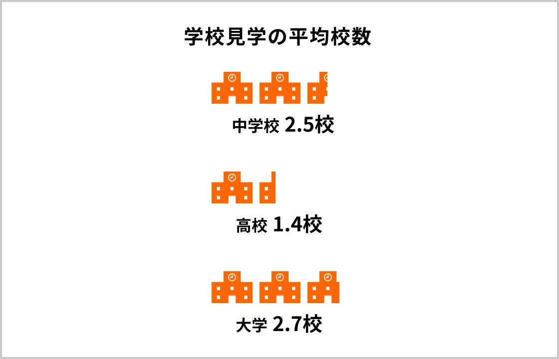 アンケート結果によると、各受験の際に保護者が学校見学に参加した平均校数は約2.5校でした。受験生の保護者の多くが複数の学校見学に参加していることがわかります。この結果からも、子どもに最適な学校を見つけるためには複数の選択肢を比較検討することが重要だといえるでしょう。
