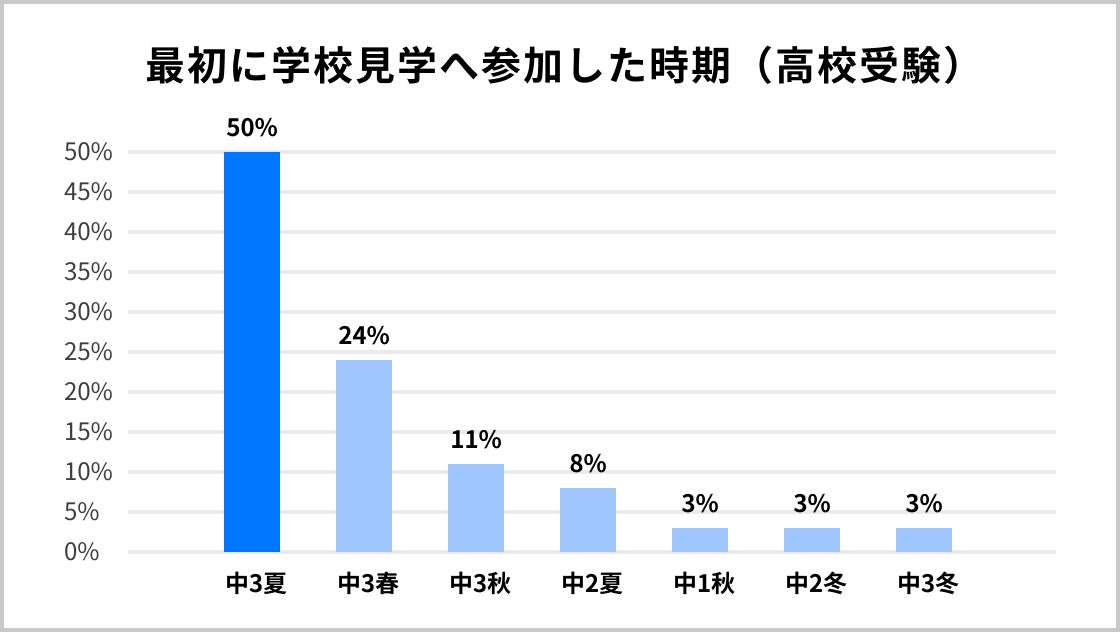 高校受験では、「中3 夏」(50%)がもっとも多く、次いで「中3 春」(24%)でした。「中3 夏」は、模試や学校説明会、体験入学などが活発に行われる時期でもあり多くなりましたが、「中3 秋」(11%)や「中2 夏」(8%)も一定数いるので、受験を意識したタイミングで参加している人もいると考えられます。