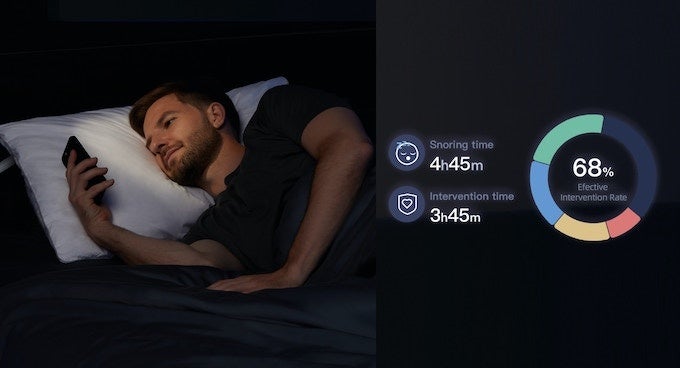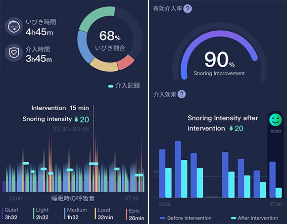 ユーザーの睡眠といびきのデータはAIで分析され、睡眠時間、睡眠時の呼吸音、介入効果などのレポートを生成して自身の状態を確認できます。睡眠パターンおよび睡眠状態を科学的評価と総合分析をし、運動、食事、睡眠習慣などの視点からアドバイスを行い、睡眠改善をサポートします。