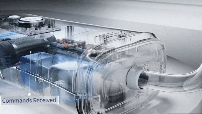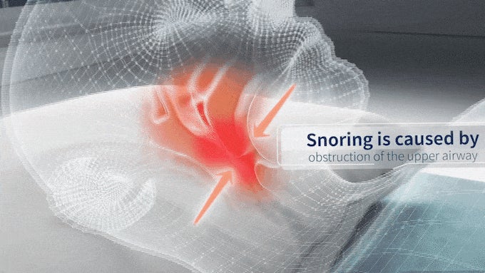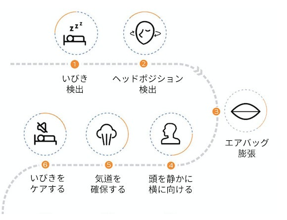 枕に内蔵されたセンサーが頭の位置を正確に認識します。センサーがいびきの音と振動を感知すると、エアーバッグが膨らみ、枕に傾斜をつけることで頭を傾けていびきを止めます。