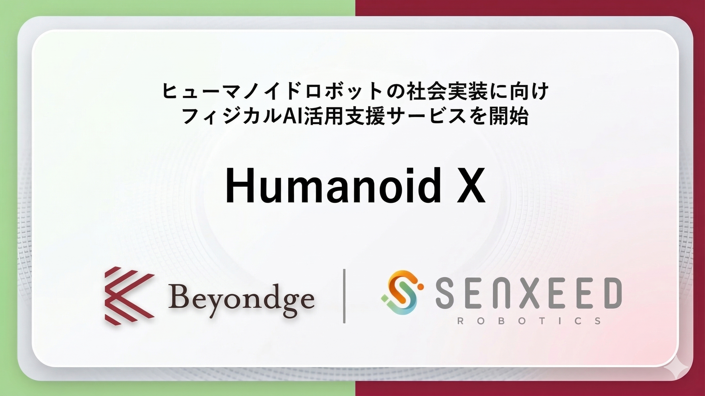 スタートアップの創出・バリューアップと大企業のグロースハックを強みとするBeyondge株式会社(本社:東京都渋谷区、代表取締役CEO:野上隆徳、以下:Beyondge)は、サービスロボットのソリューション開発・導入支援のパイオニアであるSenxeed Robotics株式会社(本社:東京都港区、代表取締役CEO:田口大悟、以下:Senxeed Robotics)と共同で、ヒューマノイドロボットの社会実装を加速させることを目的として、業務提携契約を締結し、フィジカルAI活用支援サービス「Humanoid X(ヒューマノイドエックス)」の提供を開始いたします。