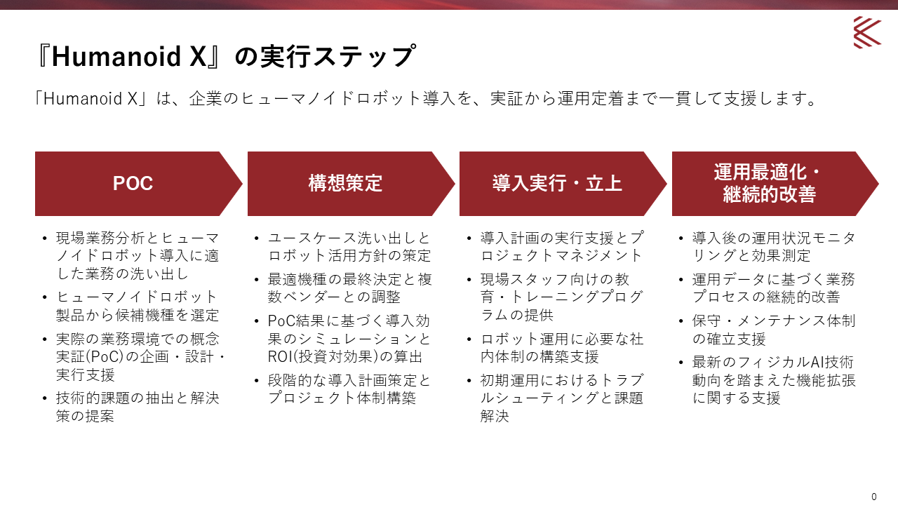 「Humanoid X」は、企業のヒューマノイドロボット導入を、実証から運用定着まで一貫して支援します。ヒューマノイドロボットは、構想策定の前に実際の現場での検証が重要となるため、PoCを起点とした4つのステップで支援します。