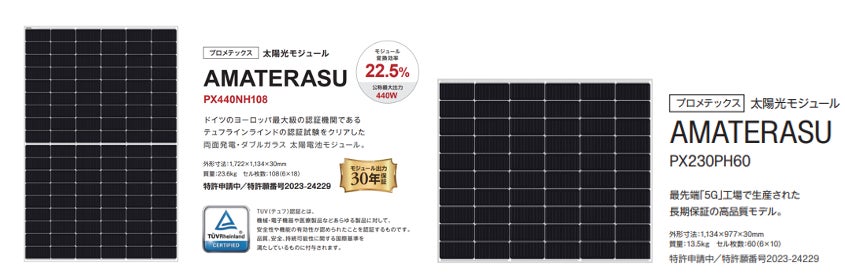 2024年12月18日、株式会社プロメテックスホールディングス(本社:愛知県名古屋市、代表取締役社長:加藤皇大、以下「弊社」)は、雪国や塩害地域、砂漠、高温多湿など多様な環境下で使用可能な耐久性と、都市部の狭小屋根にも対応した高性能でコンパクトな「グローバル基準」の最新太陽光モジュール「AMATERASU」シリーズ【PX440NH108】【PX230PH60】の販売開始を正式に発表しました。