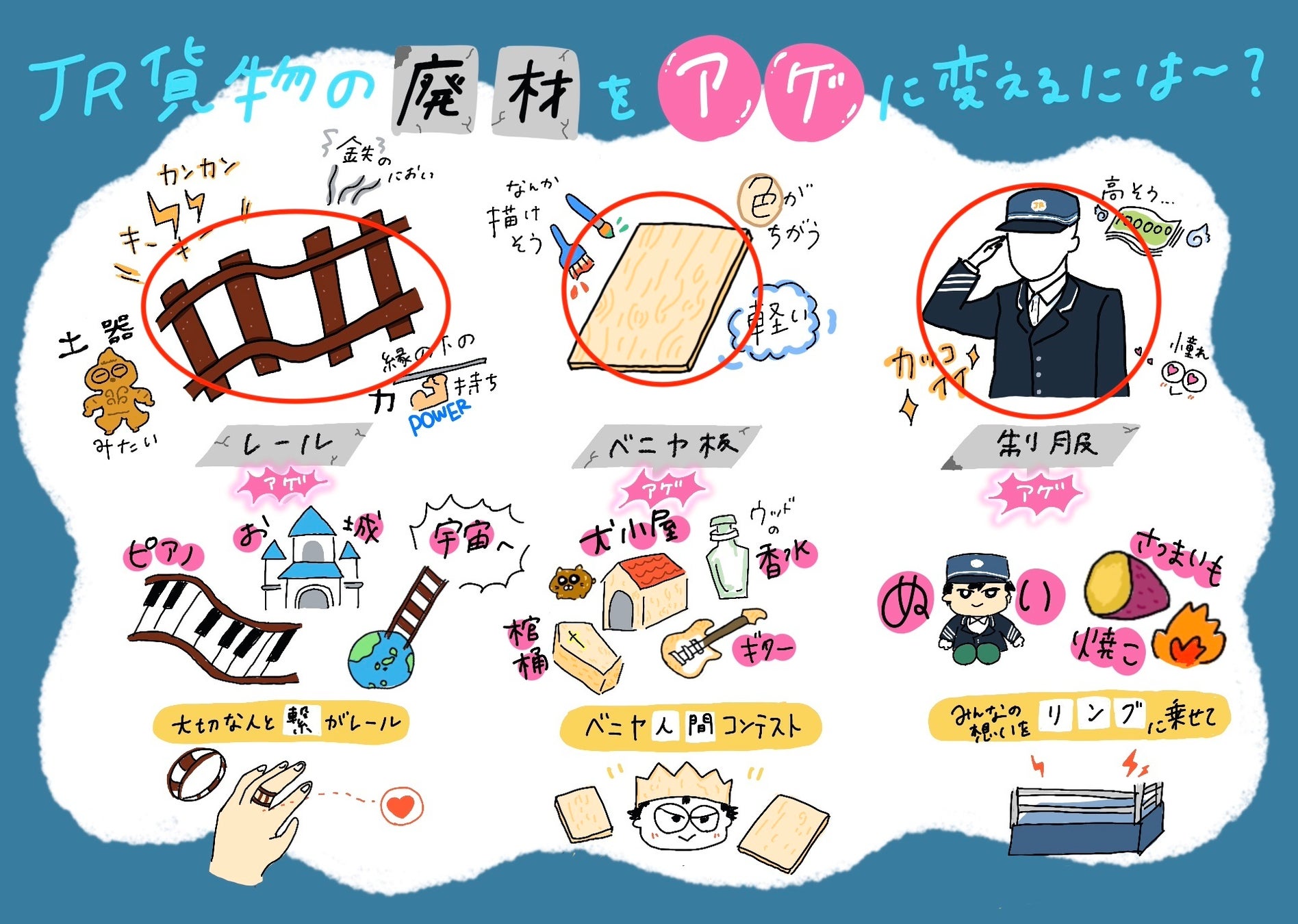 今回のアイデアブレストの中で、ベニヤ板を切り抜いて、顔ハメパネルにしようといったアイデアは工夫してすぐに出来そうだなと思いました。また普段、線路を見ていて指輪にしようってアイデアは考えもつかなかったので、斬新ですごいなって思いました。JR貨物の人は全体的に真面目にものを考える人が多いので、肩書きを抜きにして考えていくことで意見がたくさん出たので、建前抜きで話すことがJR貨物でも広がっていくと良いのかなと思いました。