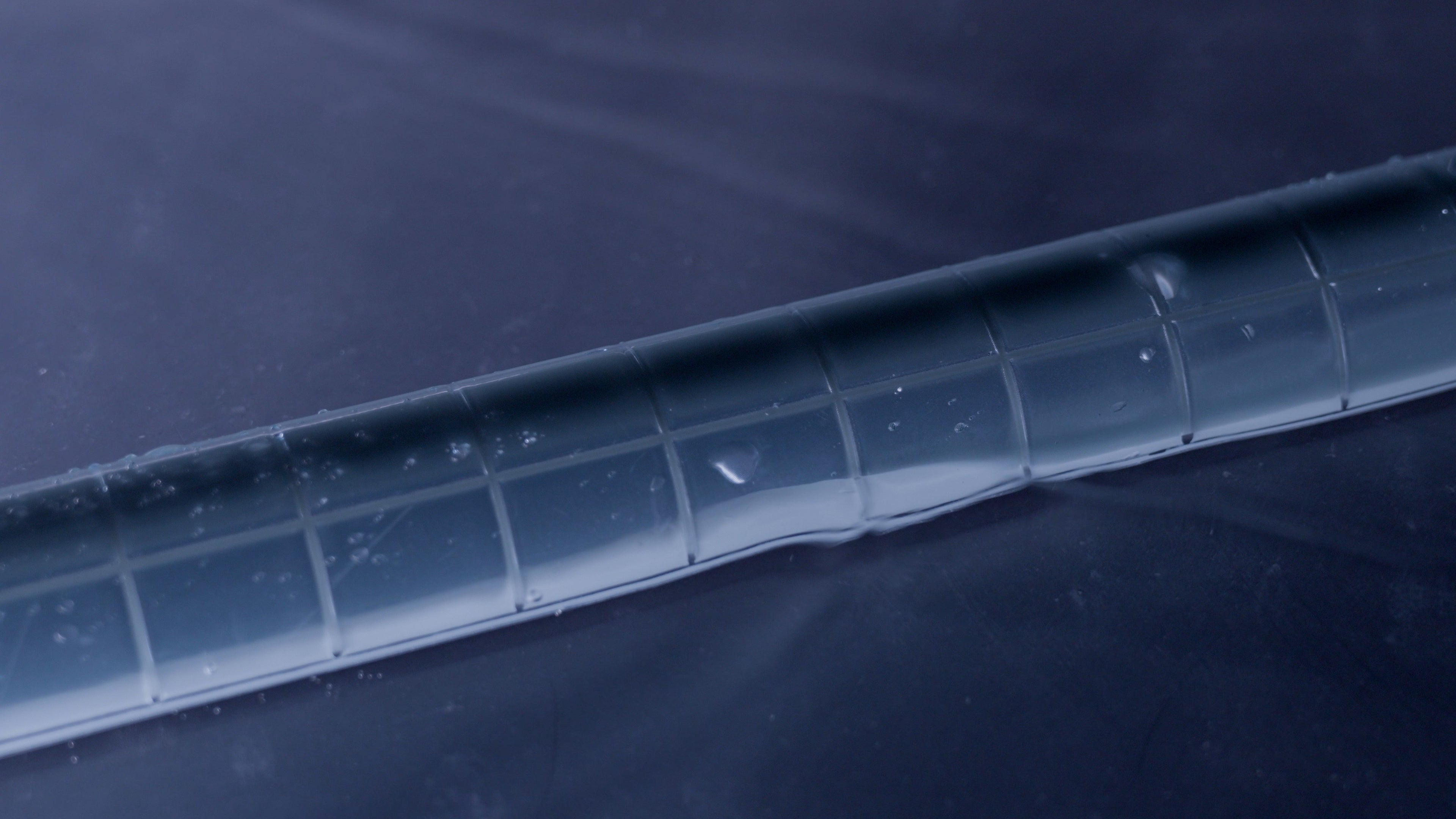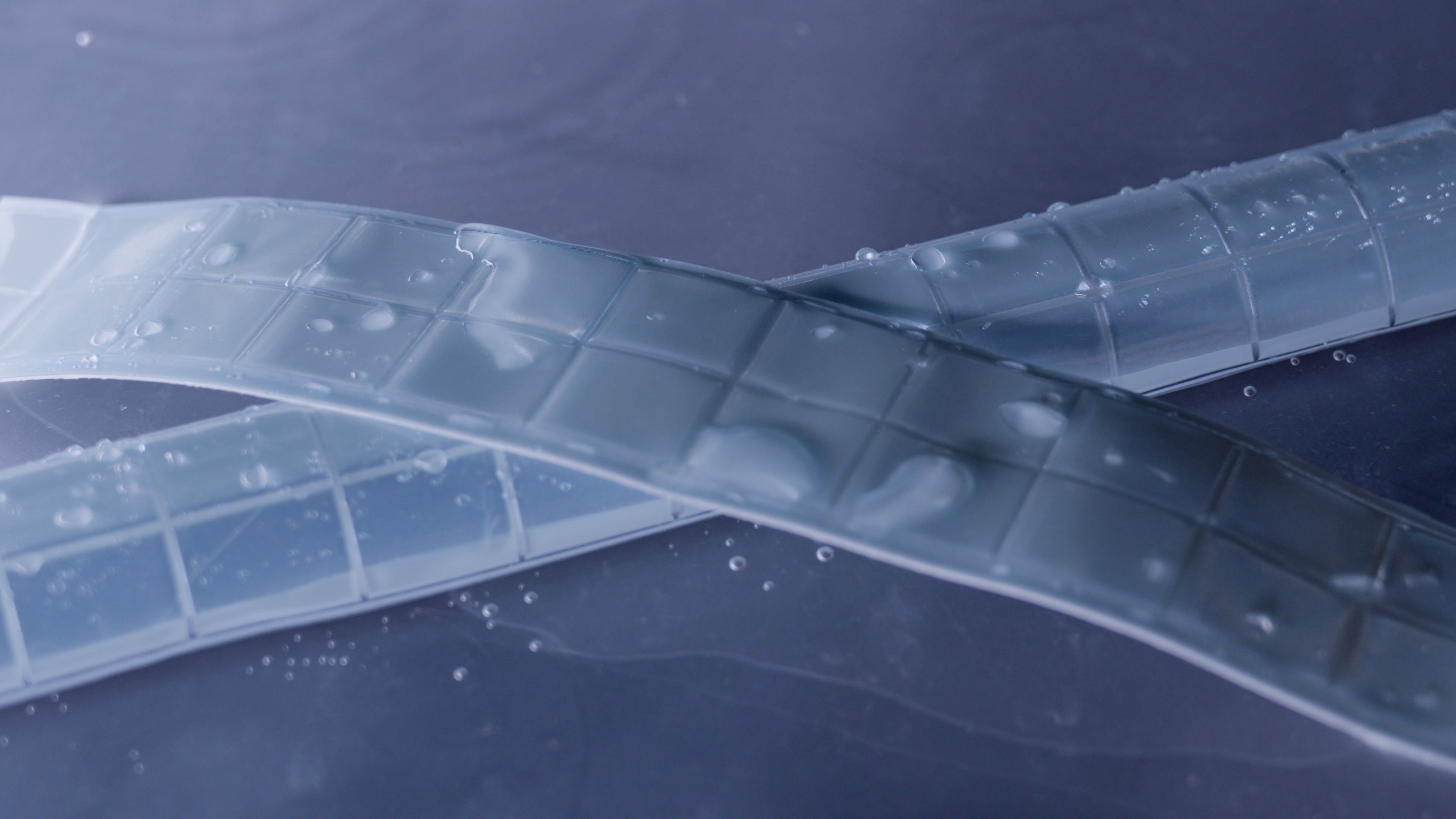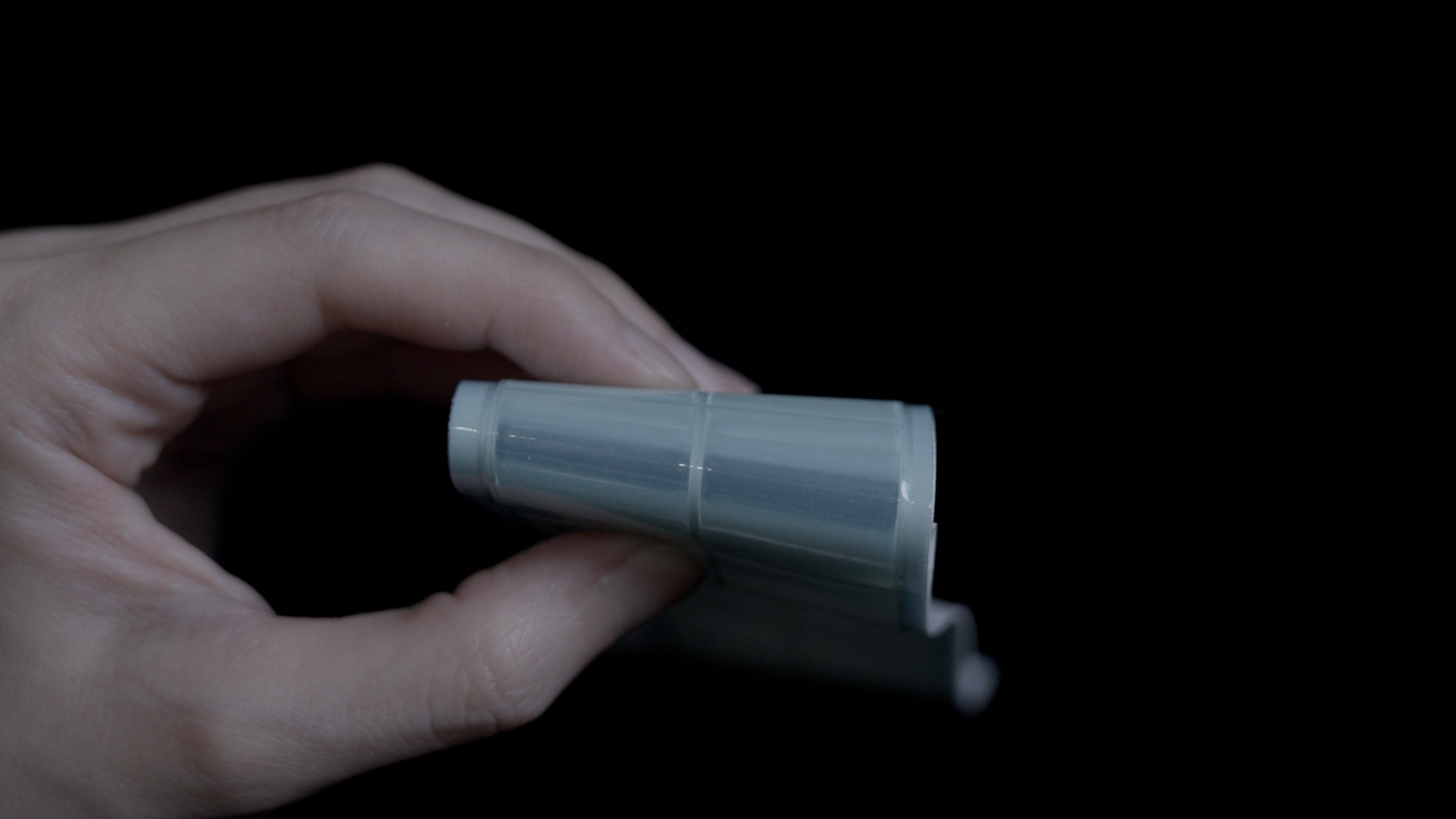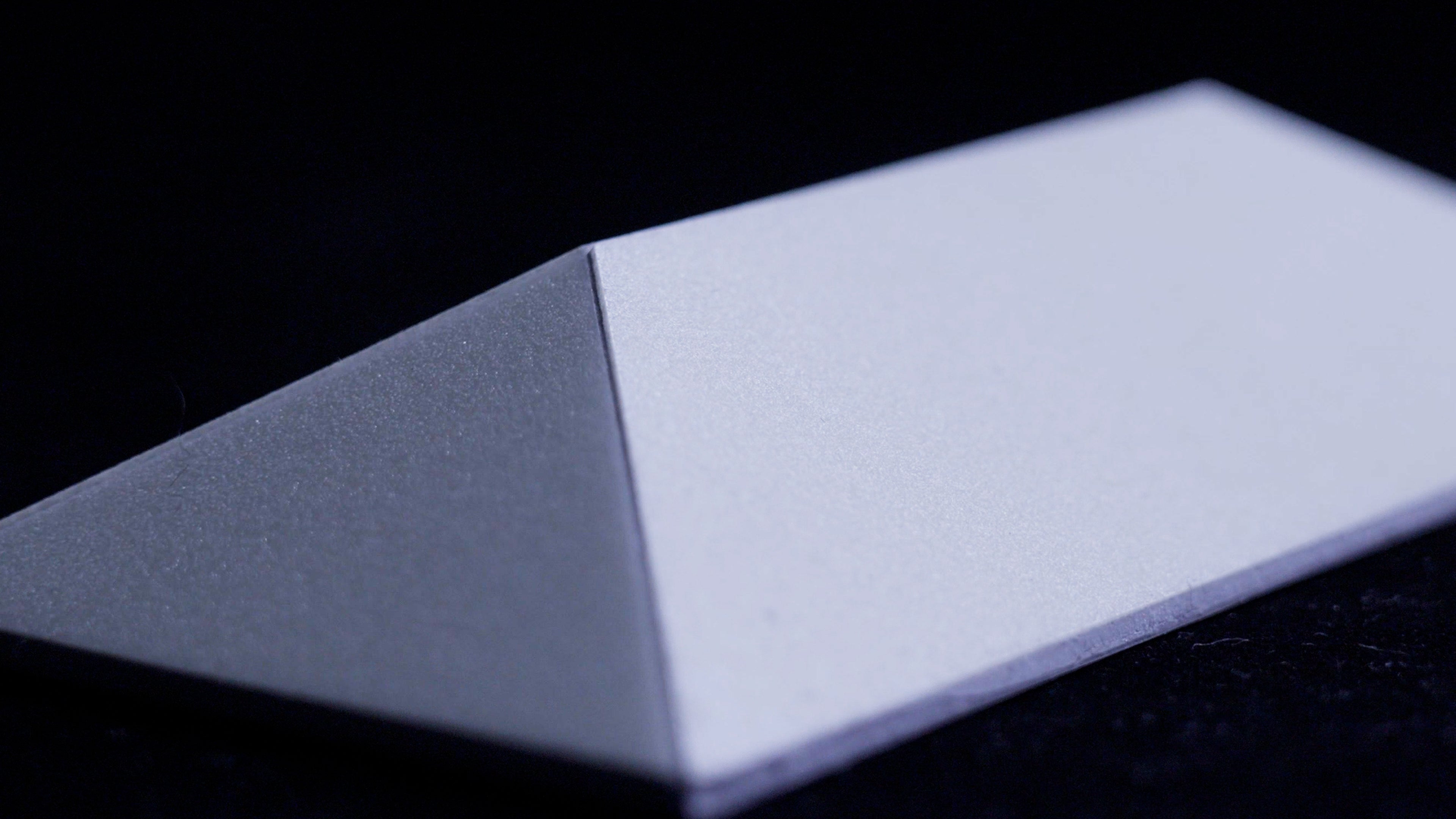 1枚3役の積層構造フィルム。蓄光材+反射材+カラーリング(乳白色)を全面積で実現