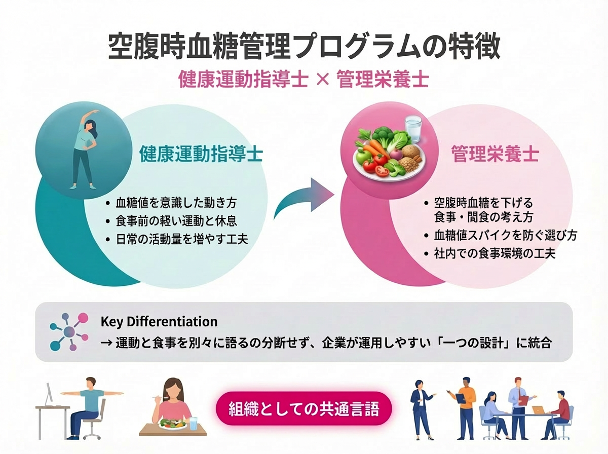 運動と食を分断せず、企業が運用しやすい「一つの設計」として整える点が特徴です。