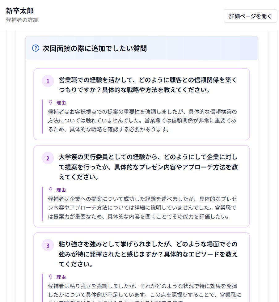 単に質問を提案するだけでなく、「なぜその質問が必要か」の理由も明示。例えば「マネジメント経験がある」という回答に対し、「具体的な規模感が不明確なため、チーム規模を確認すべき」といった形で提案します。