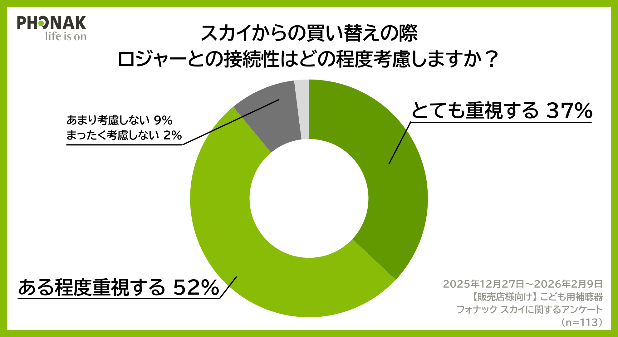 補聴器と一緒に使うデジタルワイヤレス補聴援助システムのロジャーは、騒音下や距離のある会話など、補聴器だけでは聞き取りが難しい場面で大きな力を発揮します。フォナックが行ったアンケートで、スカイからの買い替え時に約90%の販売店が「ロジャーとの接続性を重視する」と回答しています。