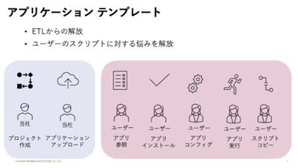 内製化促進の新機能の一つとして、アプリケーションテンプレート機能を追加しました。「HULFT Square」はノーコード開発を提供しているものの、まだ不慣れな時期はスクリプト作成に試行錯誤する場合があります。この試行錯誤する負担を軽減するため、利用可能なスクリプトなどのテンプレートを当社が作成し、「HULFT Square」上の『App Square』で提供します。お客さまは必要なアプリケーションテンプレートを自社環境にインストールし、設定を変更してそのまま利用することも複製してカスタマイズして利用することも可能です。