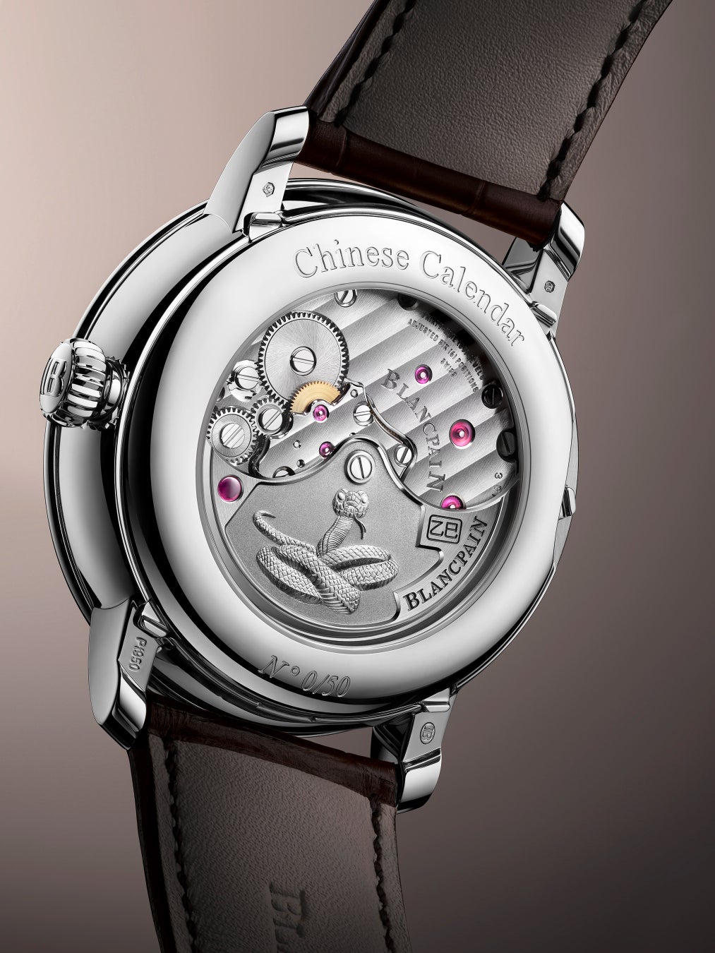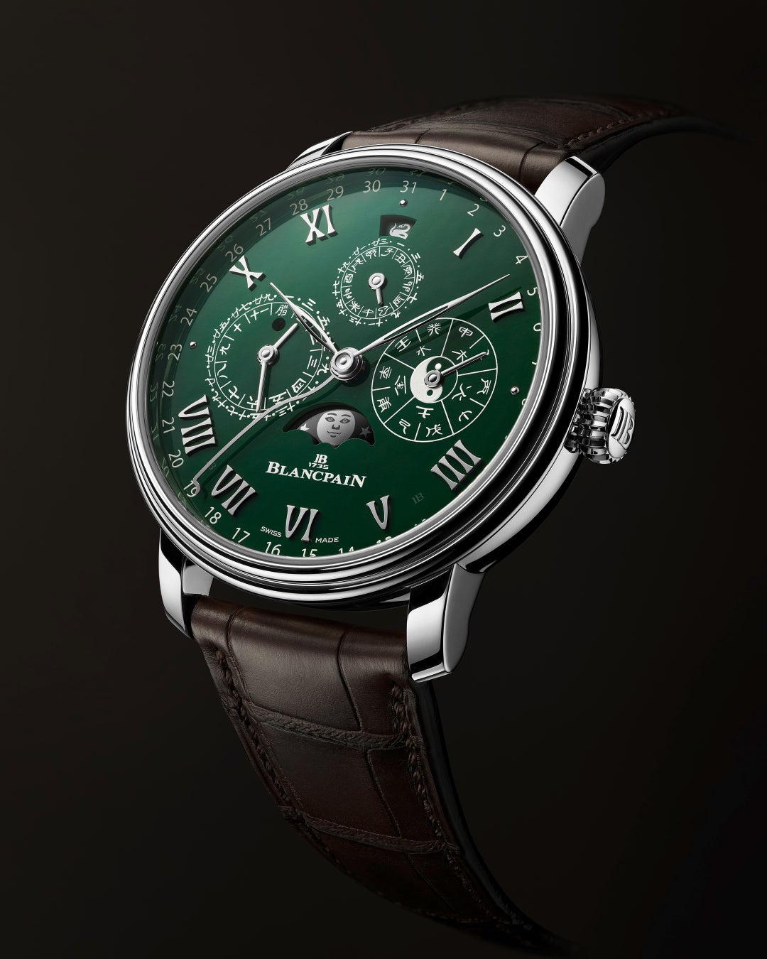 ブランパンは 2012 年、複雑な中国暦とグレゴリオ暦の日付とムーンフェイズを組み合わせ、 東洋と西洋を融合させた腕時計「ヴィルレ トラディショナル チャイニーズ カレンダー」 を発表しました。12 年の周期が 2024 年に 2 巡目を迎えたのを機に、ブランパン は 12 時位置の窓に表示される、玉皇大帝の伝説を思わせる十二支の動物のデザインを一新しています。乙巳(きのとみ)の年である 2025 年には、グリーンのグラン・フー・エナメ ルのダイヤルに 45.2 mm 径のプラチナ製ケースを組み合わせ、デザインが見直されたヘビの姿が初めて登場します。