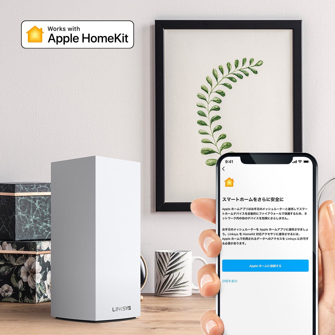 このLinksys Velopノードは、Appleのホームアプリと関連付けることで、 HomeKitアクセサリをモニタリングし、外部の脅威がご自宅のネットワークへの侵入を試みても、被害をもたらす可能性がある通信を遮断してくれます。