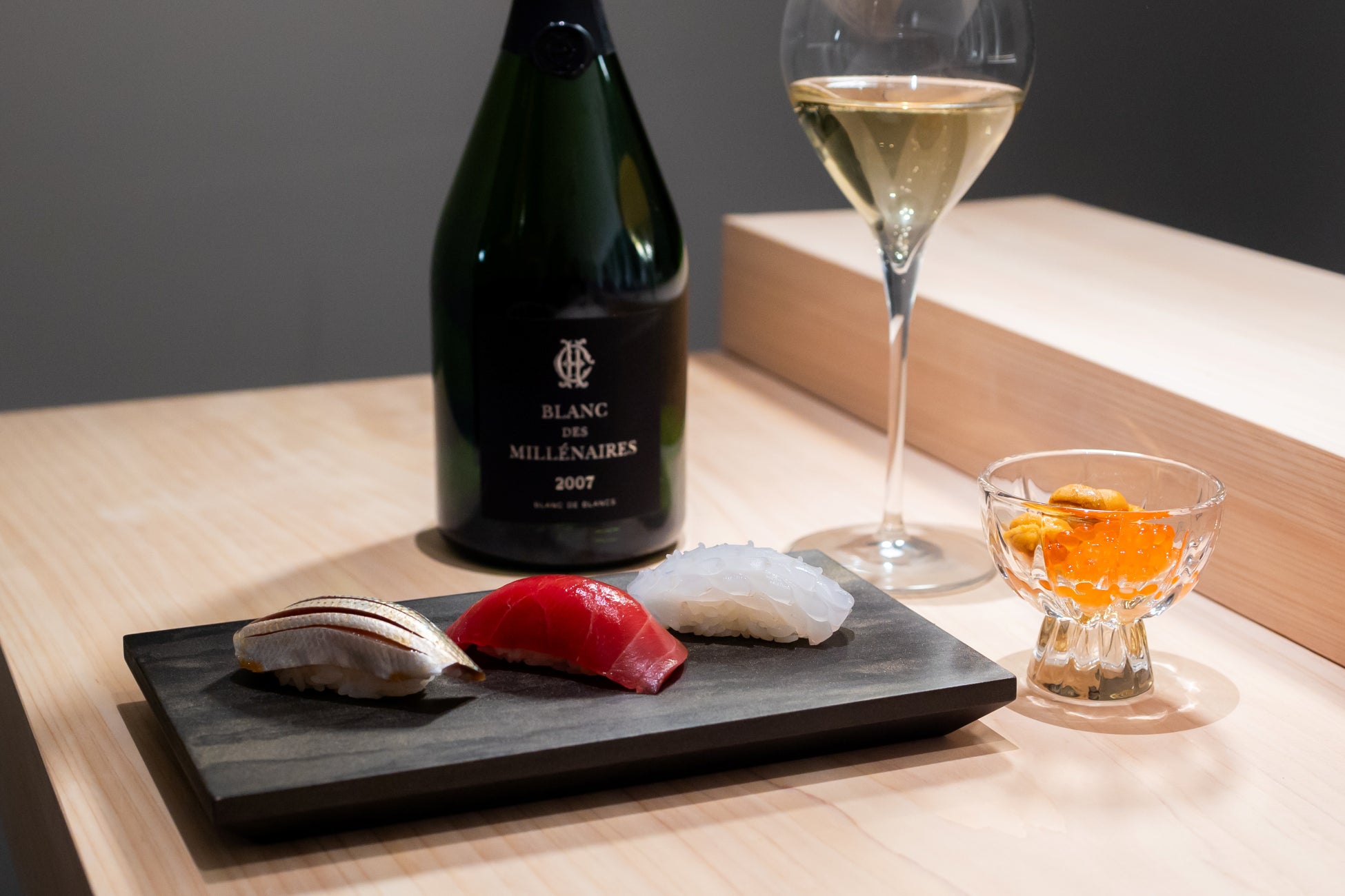 特別な夜にふさわしいラリエシャンパーニュのラインナップを堪能できるスペシャルディナーを開催します。ラリエのクラフトマンシップが光るオートクチュールなシャンパーニュと、日本を代表する食文化である鮨が奏でるハーモニーを、生産者のストーリーと共にご堪能ください。また、お食事前には、シャンパーニュを片手にヴァイオリンの生演奏を優雅にお愉しみいただけるほか、お土産には、ラリエのハーフボトルのシャンパーニュもプレゼントいたします。