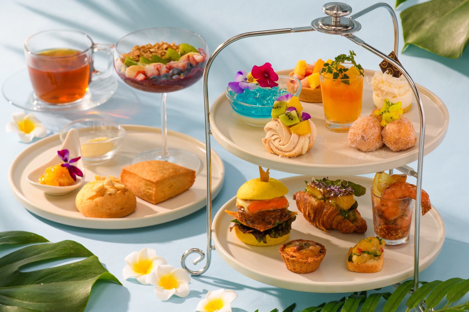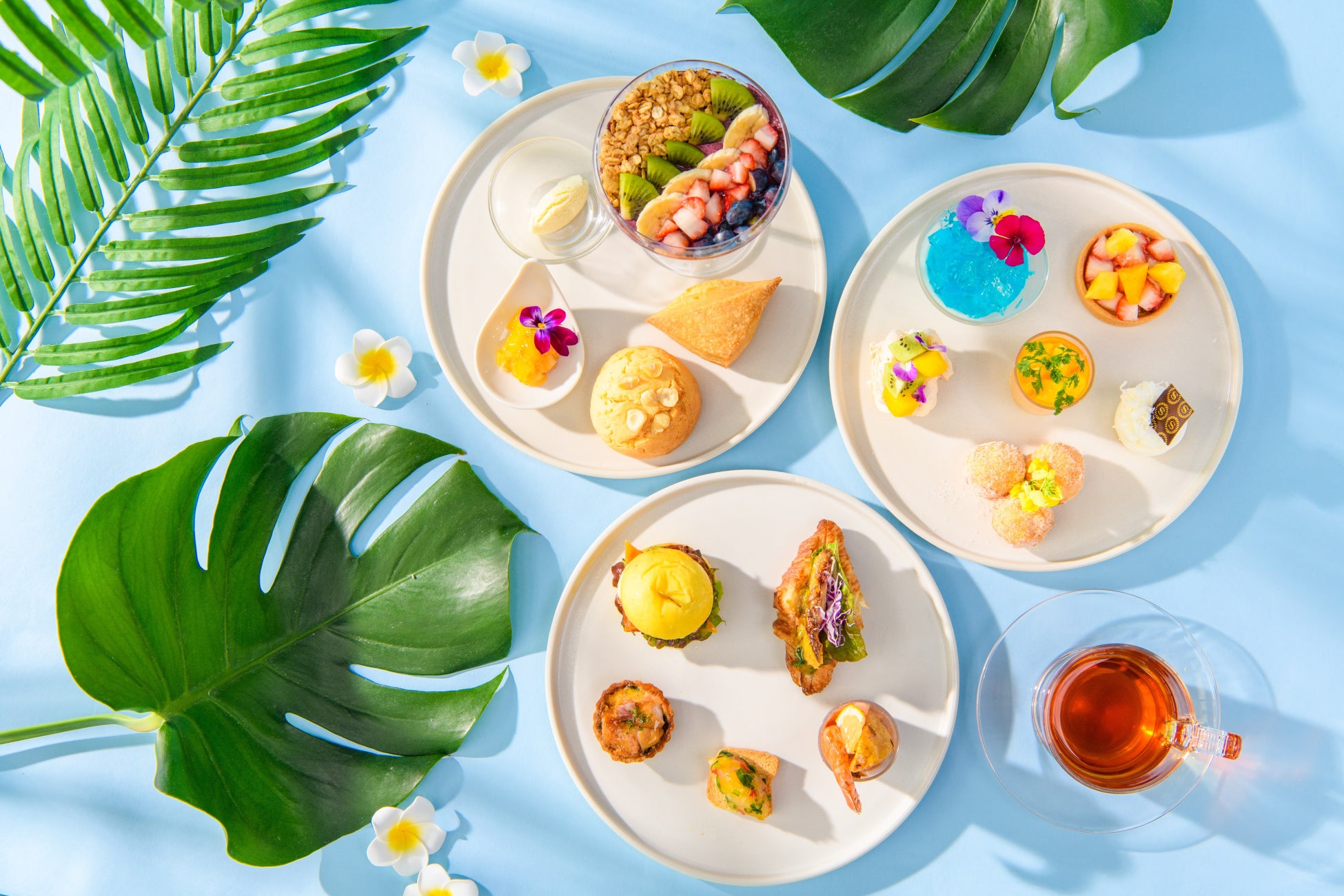 近年ハワイで人気のスコフィン(スコーン+マフィンのハイブリッドスイーツ)やカクテルに盛り付けることで華やかさを演出したアサイーボウル、食べやすいサイズのロコモコ風ミニバーガーなど、シェラトン鹿児島ならではのハワイアングルメが楽しめるアフタヌーンティーです。ハワイをイメージしたトロピカルな味わいの限定フレーバー紅茶とペアリングでお楽しみください。
