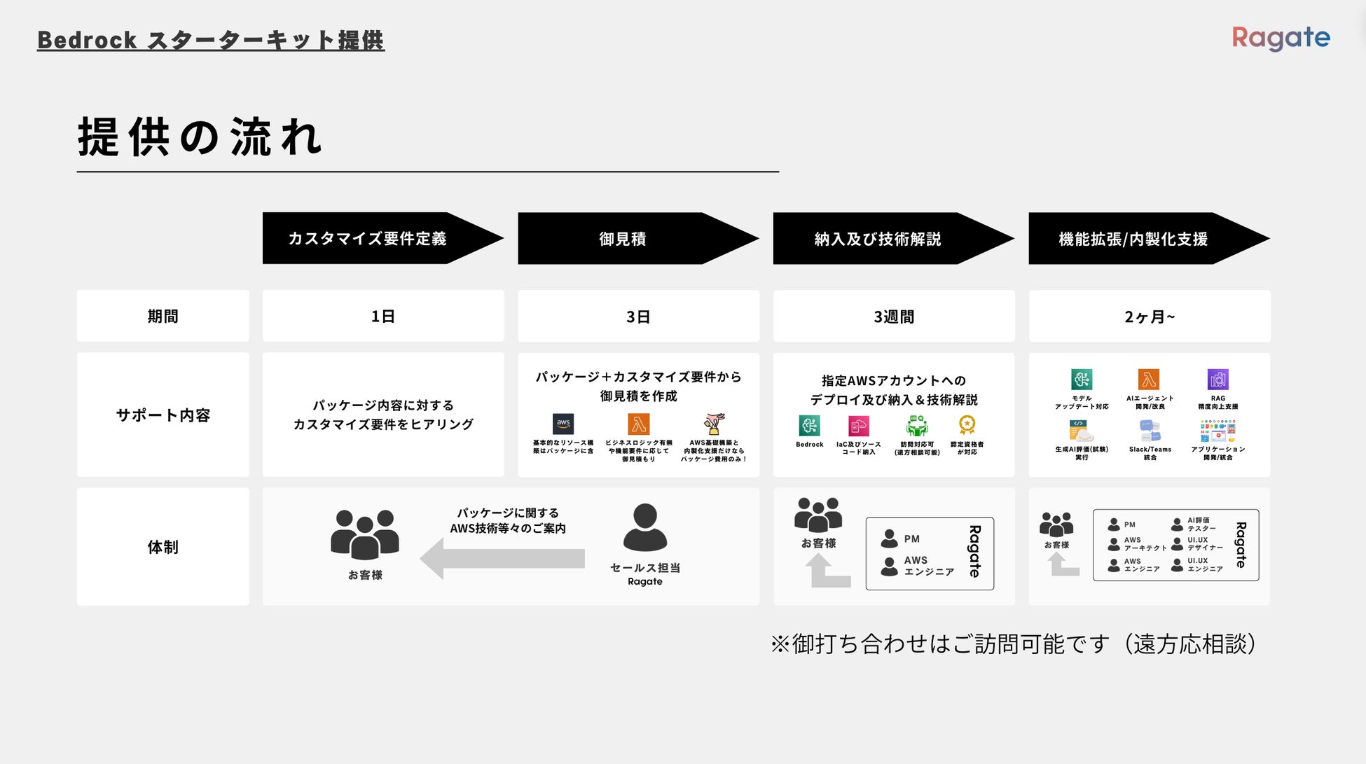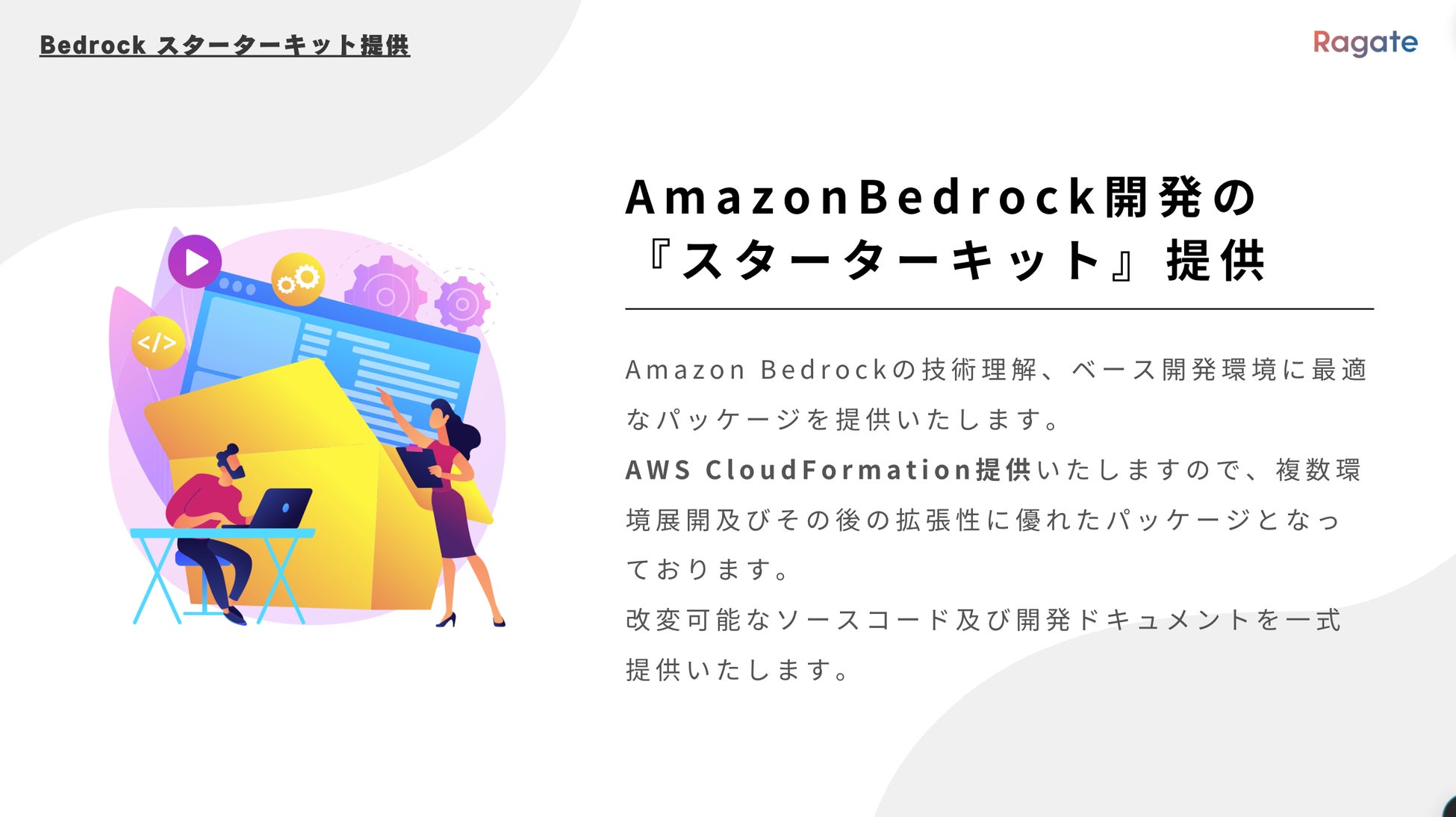 Ragate株式会社(本社:東京都中央区、代表取締役:益子竜与志)は、この度、AmazonBedrock開発の『スターターキット』提供開始を行いましたのでお知らせいたします。