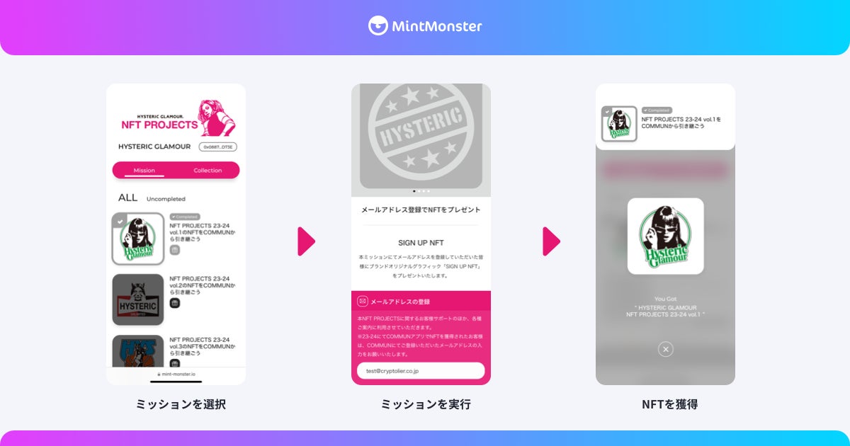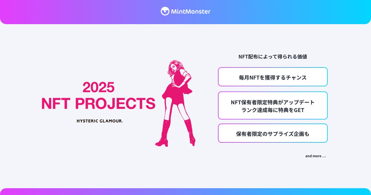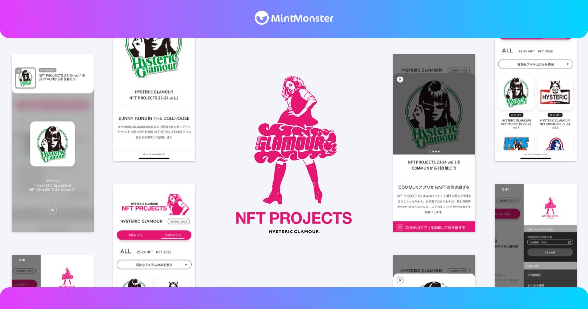 「MintMonster」の導入により、SNS(X)連携やNFT保有認証などの様々なミッション機能を活用することでHYSTERIC GLAMOURのファンの皆様に対して昨年以上に様々な施策を提供することが可能となり、ファンの皆様との接点をより多く創出でき、今後さまざまなNFT配布企画の展開が可能となります。