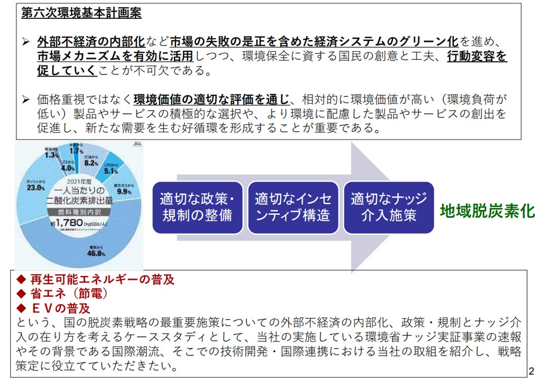 これは、脱炭素社会実現を目指す新しい国民運動「デコ活」の一環として、当社が受託している環境省ナッジ実証事業での取り組みの成果を発表するとともに、日本版ナッジ・ユニット(BEST)が編纂を進める「ナッジ戦略(ナッジを始めとする行動科学の知見の適切な活用及び普及に向けた戦略)」について、❶脱炭素とナッジ、❷ナッジ倫理(グリーンウオッシュ・スラッジの防止)、❸ナレッジマネージメント、➍EBPM等に関する提言を行ったものです。