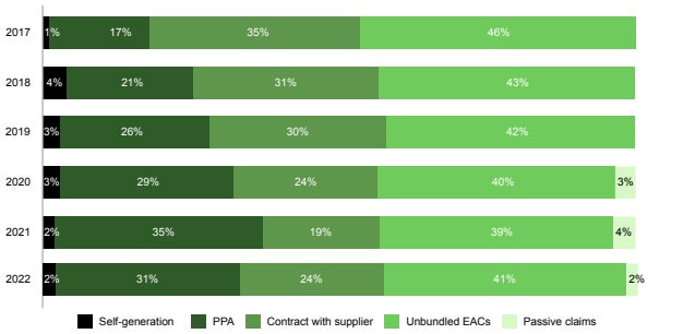 RE100の2023年年次報告書によると、「アンバンドル」証書のRE100加盟企業の再エネ電力調達量に占めるシェアは、2015年の60%から2022年には41%に減少しておりもはやマジョリティではなくなってきている。
