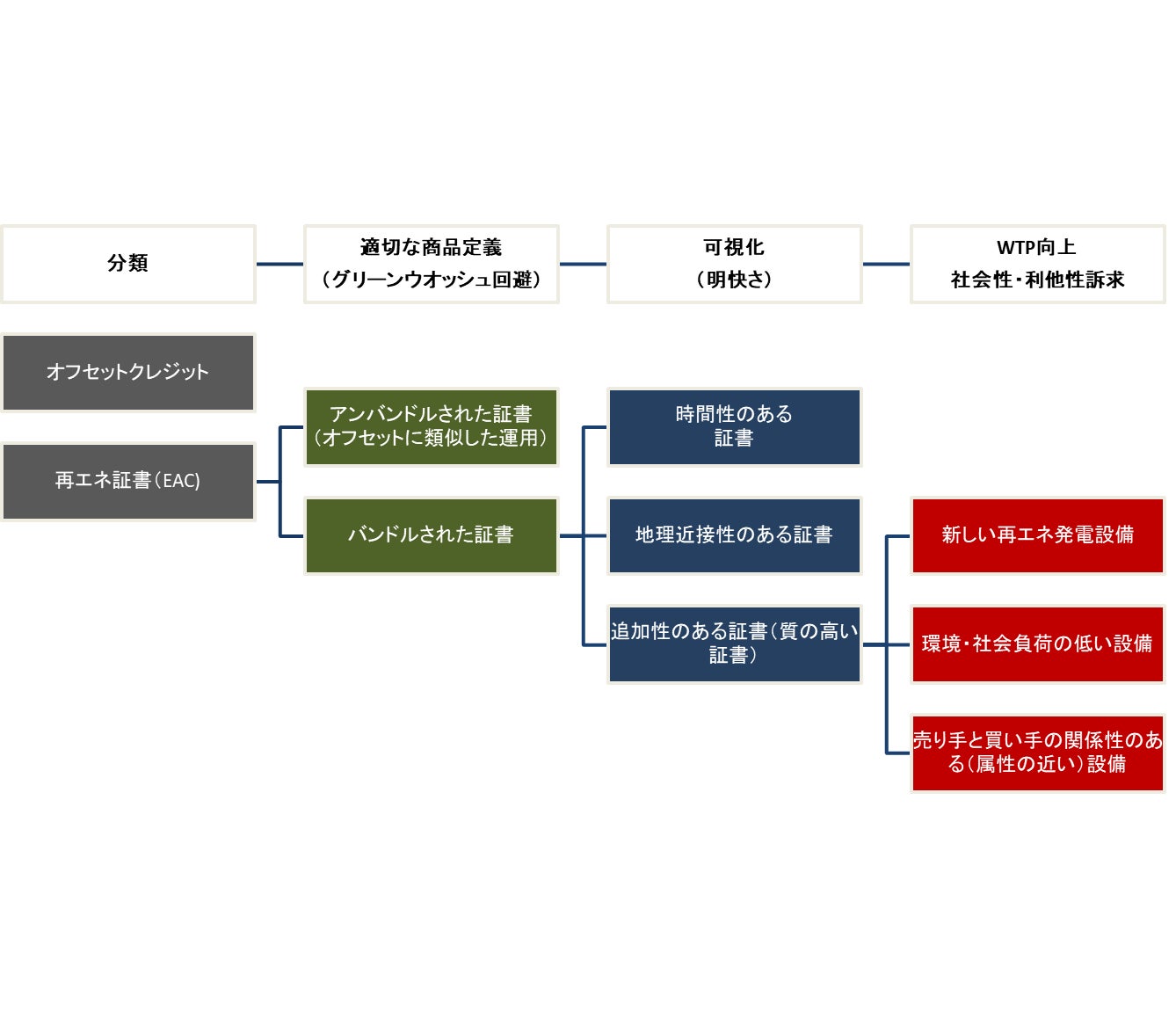 再エネ証書は、アンバンドルされた証書(オフセットクレジットに類似した運用)かバンドルされた証書に分類される。