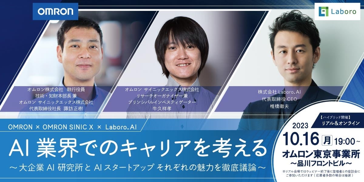 AI業界でのキャリア形成をお考えの方に向けて、国内の名だたるリーディングカンパニーのAI導入を支援する注目AIスタートアップLaboro.AIと、社会的課題の解決を目指し「人が活きるオートメーション」の実現に向け積極的にAIの活用に取り組む大手製造メーカーであるオムロンと、オムロンの考える"近未来デザイン"を創出する戦略拠点であり最新のAI技術の研究開発で価値を創出するオムロン サイニックエックス(OSX)による共同セミナーのご案内です。