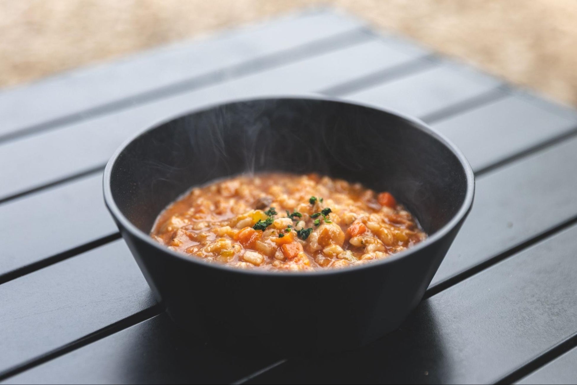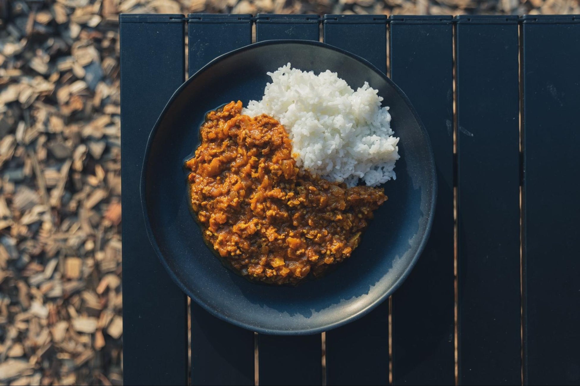 初期メニューは主食として楽しめる「キーマカレー」と「もち麦のトマトリゾット」。「サウナの後に外で食べる」シリーズは、11月30日に開業した『Earthboat Nasu』をはじめとするEarthboatの各拠点の物販※でレトルトパッケージで提供され、Earthboatの客室に備え付けのキッチンで簡単に調理しお召し上がりいただけます。