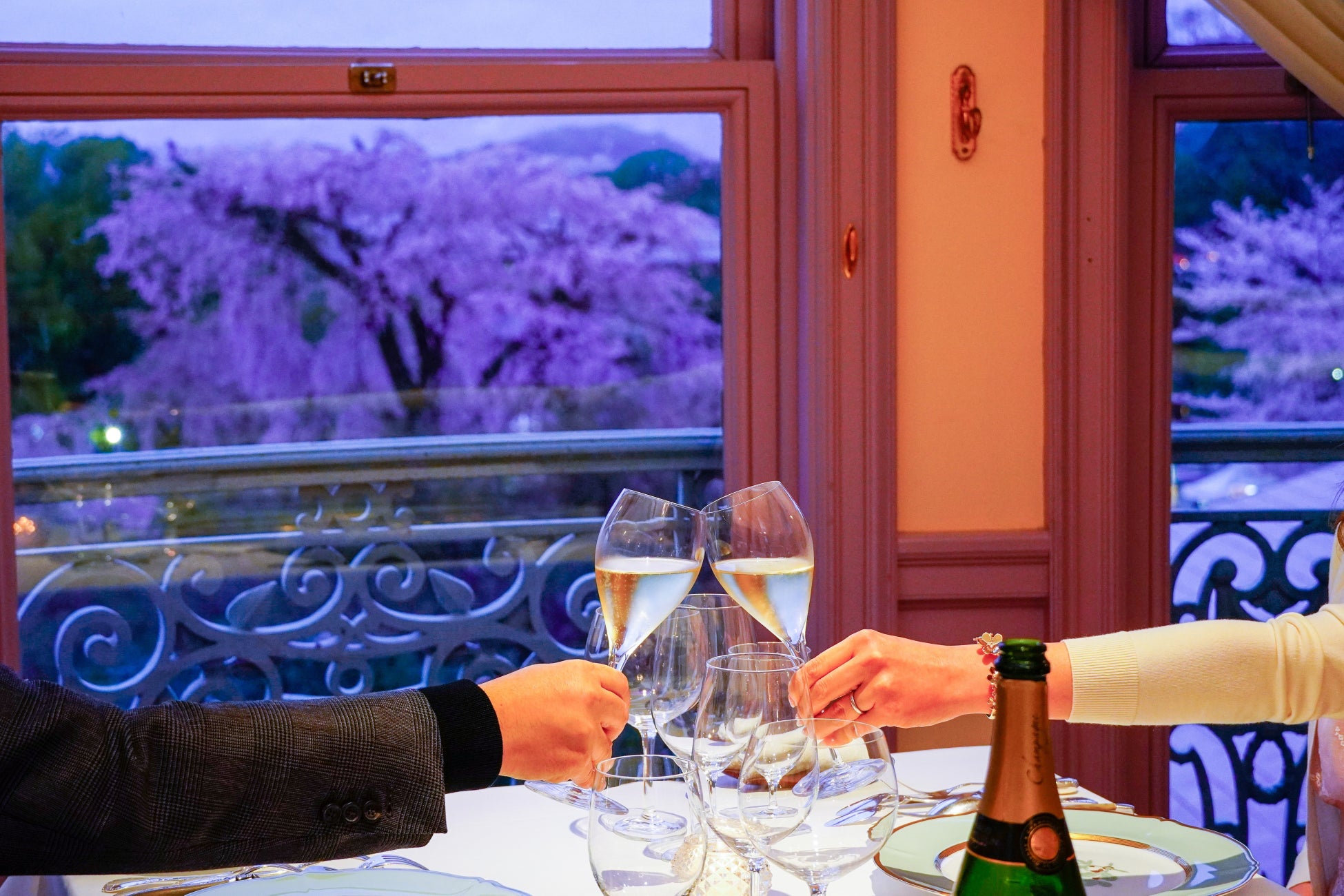 夜桜プライベートディナーは、円山公園の祇園枝垂桜に面した洋館2階の1室を貸切で過ごす、1日1組限定のディナープランです。明治時代に煙草王により建てられた歴史ある迎賓館から眺める京都屈指の桜の名所・円山公園の夜桜と、長楽館FRENCH LE CHENEの春の食材を生かしたお食事によるおもてなしで、喧騒から離れた大人の花見を堪能いただけます。