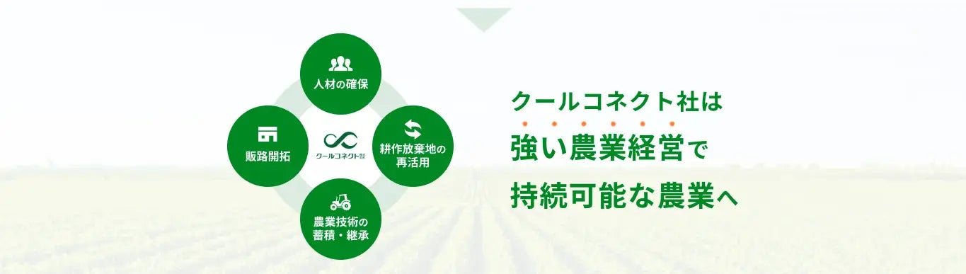 クールコネクト社では「農の未来をつなぐ」ため、日本の農業が抱える課題解決に向けた事業に取り組んでいます。農業人材の確保、耕作放棄地などの農地活用、農家ごとに積み上げられてきた高い農業技術の蓄積・継承、独自の販路開拓など、安定した強い農業経営を実現します。野菜栽培のオーナー様と共に、農業の課題を解決していきます。