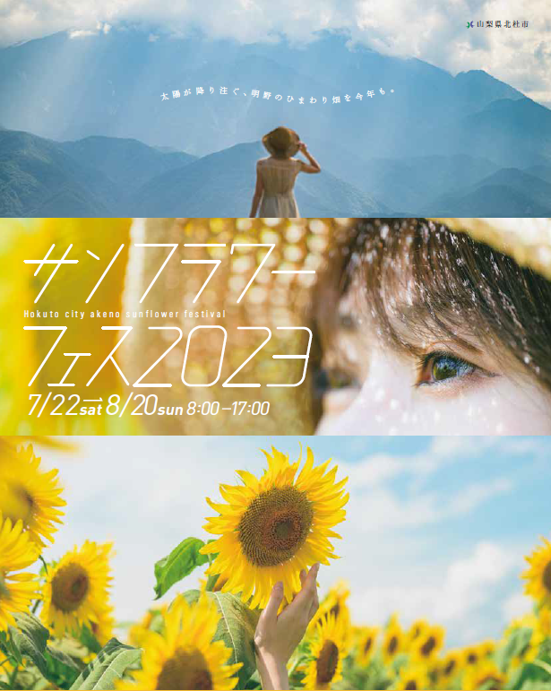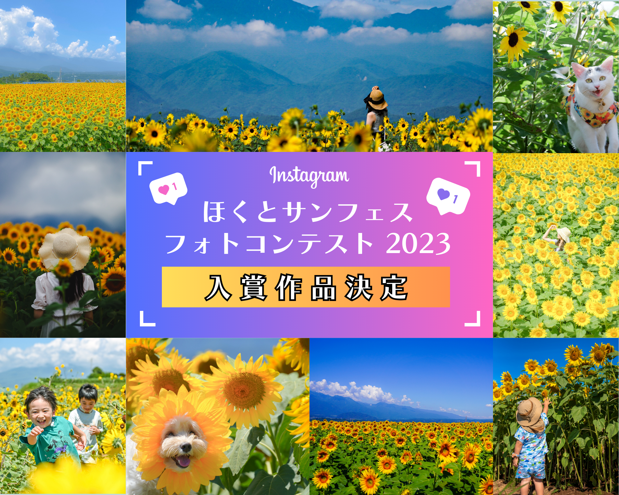 日本有数の日照時間の長さを誇る山梨県北杜市明野町では、その恵まれた自然環境を活かして、平成4年から毎年「北杜市明野サンフラワーフェス」を開催してきました。昨年までは新型コロナウイルスの流行により規模を縮小するなどしたものの、32回目を迎えた今年は、40万本のひまわりを咲かせ、7月22日(土)から8月20日(日)の間に、7万人を超える皆さまにお越しいただきました。期間中は、「ほくとサンフェスフォトコンテスト2023」として、Instagramで会場での1枚を募集。応募総数500点以上の中から、9点の入賞作品を決定いたしました。