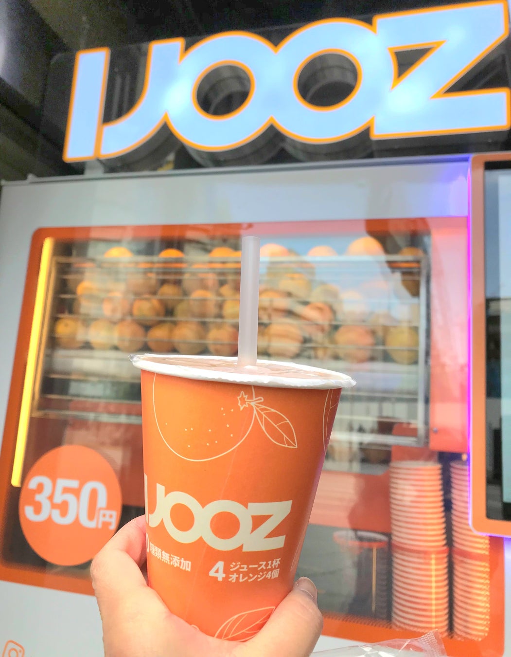 IJOOZ のオレンジジュースは自動販売機内でオレンジまるまる4個を生搾りしたもので、水や砂糖も不使用なため、オレンジの美味しさを存分に味わっていただけます。また添加物も一切不使用で、安心してお飲みいただけます。 280mlと大容量で350円とお手頃な価格で美味しいオレンジジュースが味わえると、トレンドに敏感な方々やお子様連れ、健康志向の方々を中心にご好評いただいています。