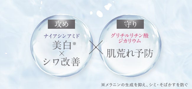 有効成分「ナイアシンアミド」と「グリチルリチン酸ジカリウム」配合でトライアングル効能。長時間使用しても乾燥しないうるおうお肌へ。