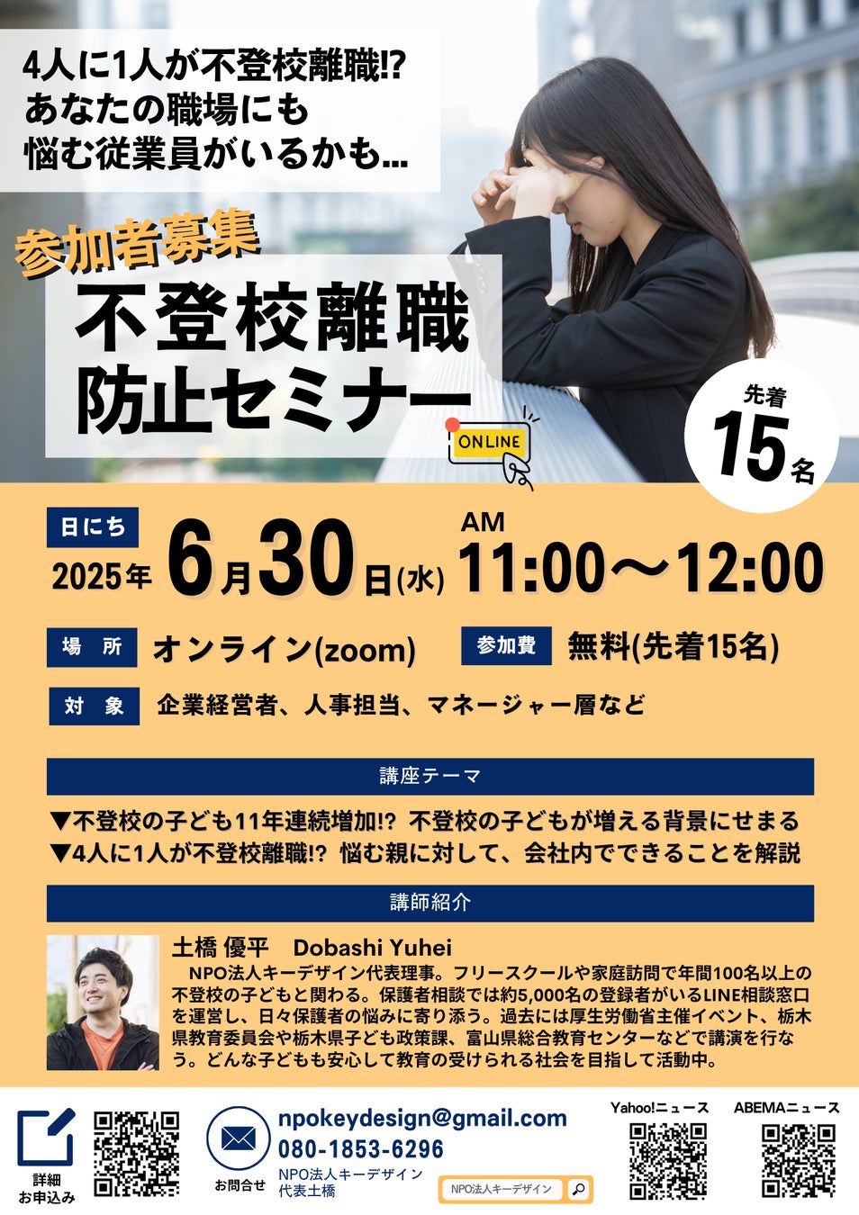 NPO法人キーデザイン(栃木県宇都宮市、代表理事:土橋優平)は、企業の経営者・人事担当者・管理職向けに「不登校離職防止」をテーマとしたオンライン無料セミナーを開催いたします。