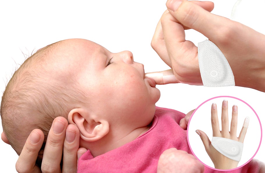 助産師がデバイスを手に装着し、センサーが付いた小指部分を赤ちゃんの口の中に挿入します。
